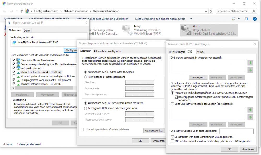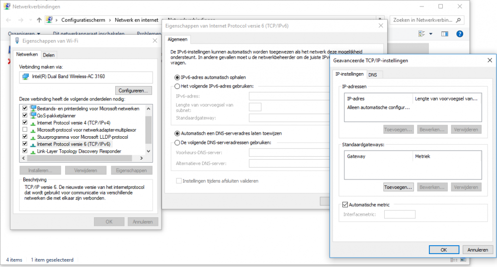 Na een weekendje proberen: 1. via wifi krijgt mijn pc problemen in de browser terwijl andere pc's, smartphones, ... gewoon kunnen verder werken. 2. om de x minuten blijft chrome haperen. Dit manifesteert zich door "Google Chrome (reageert niet)" in de titelbalk; "wachten op ..." of "Host vaststellen"; het zandlopertje dat blijft draaien. 3. Andere browser Edge geprobeerd. Daar blijft gewoon het zandlopertje draaien. Het probleem doet zich ongeveer op hetzelfde moment voor. 4. Als ik dan netwerkcontrole van Windows 10 doe zegt die: "problemen met breedbandmodem, de verbinding tussen toegangspunt en internet is defect" en "standaardgateway is niet beschikbaar" 5. Na enige tijd (5 à 10 minuten) komt alles weer ok en kan ik even verder werken totdat hetzelfde probleem zich voordoet. 6. Via de kabel lijkt alles normaal te werken. Ik voeg een aantal schermknipsels bij. -