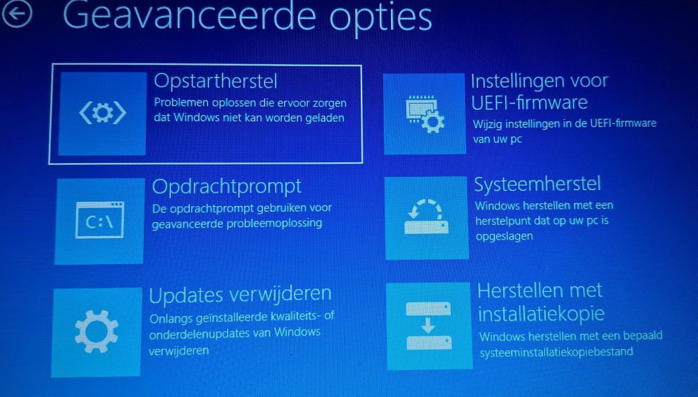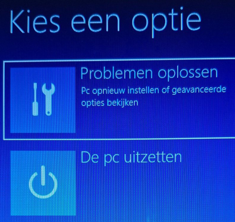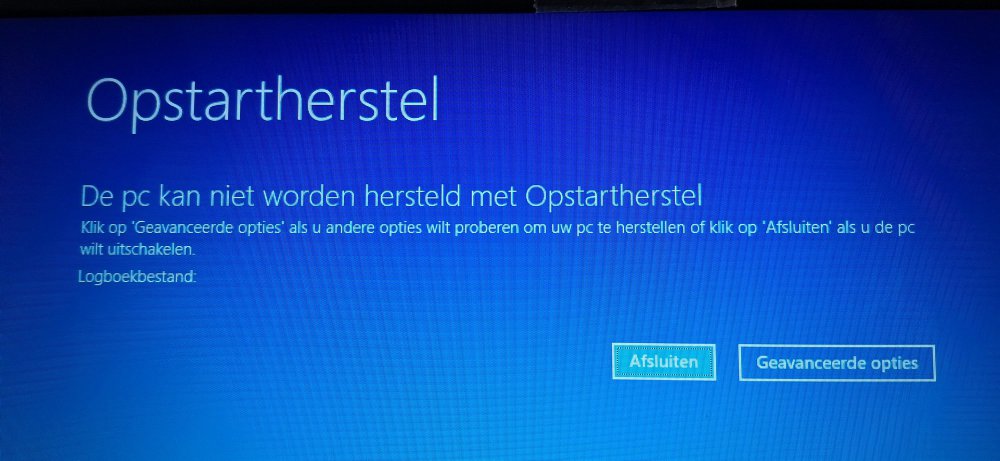 8. Na de recentste update van Windows 10 geraak ik niet meer in Windows. Na opstart krijg ik een blauw scherm met "Problemen oplossen / PC uitzetten" Opstart- of systeemherstel : geen resultaat Updates verwijderen lukt niet Enfin : niets werkt. Een commando ingeven bij de opdrachtprompt ken ik niet... Ik heb indertijd 4 "herstelschijven" gemaakt, werkt ook niet, de laptop vindt ze niet denk ik. Graag hulp aub. PS foto's van het scherm in bijlage.