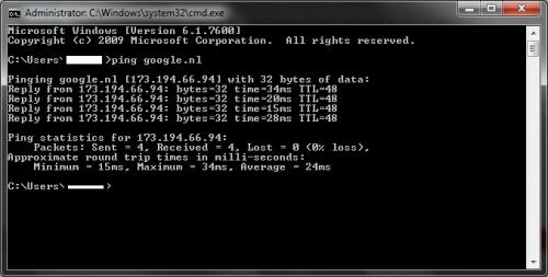 Ga naar uitvoeren, tik vervolgens "cmd" in. Er verschijnt een command prompt. Vul hier: "ping google.nl" in. Wat is het resultaat? Hetzelfde als hieronder weergegeven?