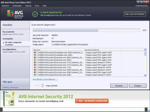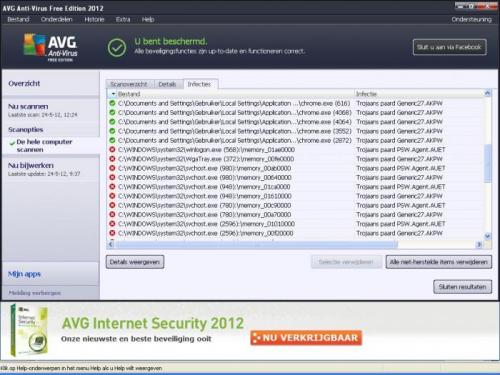Hallo, ik ben met de computer van mijn oom bezig die helemaal niets meer deed en ben redelijk ver gekomen om alles weer te fixen. Alleen nu heb ik wanneer ik scan (AVG FREE 2012) nog steeds last van trojaanse paarden die uiteraard niet verwijdert kunnen worden door AVG. Heb al van alles geprobeerd maar kom niet verder. Blijf nu elke keer steken op zo'n 50 bedreigingen waarvan dan ongeveer de helft niet verwijdert wordt. Wie kan mij helpen? Hieronder mijn hijackthis logfile. Alvast bedankt! Logfile of Trend Micro HijackThis v2.0.4 Scan saved at 19:40:10, on 23-5-2012 Platform: Windows XP SP3 (WinNT 5.01.2600) MSIE: Internet Explorer v7.00 (7.00.6000.17109) Boot mode: Normal Running processes: C:\WINDOWS\System32\smss.exe C:\WINDOWS\system32\winlogon.exe C:\WINDOWS\system32\services.exe C:\WINDOWS\system32\lsass.exe C:\WINDOWS\system32\svchost.exe C:\WINDOWS\System32\svchost.exe C:\WINDOWS\system32\svchost.exe C:\WINDOWS\system32\spoolsv.exe C:\Program Files\Microsoft Office\Office12\GrooveMonitor.exe C:\Program Files\Common Files\Java\Java Update\jusched.exe C:\Program Files\AVG\AVG2012\avgtray.exe C:\Program Files\Windows Media Player\WMPNSCFG.exe C:\Program Files\AVG\AVG2012\avgwdsvc.exe C:\WINDOWS\System32\svchost.exe C:\Program Files\Java\jre6\bin\jqs.exe C:\WINDOWS\System32\svchost.exe C:\WINDOWS\System32\svchost.exe C:\Program Files\Common Files\AVG Secure Search\vToolbarUpdater\10.2.0\ToolbarUpdater.exe C:\Program Files\AVG\AVG2012\avgidsagent.exe C:\Program Files\AVG\AVG2012\avgnsx.exe C:\Program Files\AVG\AVG2012\avgemcx.exe C:\Program Files\AVG\AVG2012\avgrsx.exe C:\Program Files\AVG\AVG2012\avgcsrvx.exe C:\WINDOWS\explorer.exe C:\WINDOWS\system32\ctfmon.exe C:\Documents and Settings\Gebruiker\Local Settings\Application Data\Google\Chrome\Application\chrome.exe C:\Documents and Settings\Gebruiker\Local Settings\Application Data\Google\Chrome\Application\chrome.exe C:\Documents and Settings\Gebruiker\Local Settings\Application Data\Google\Chrome\Application\chrome.exe C:\Documents and Settings\Gebruiker\Local Settings\Application Data\Google\Chrome\Application\chrome.exe C:\Documents and Settings\Gebruiker\Local Settings\Application Data\Google\Chrome\Application\chrome.exe C:\Documents and Settings\Gebruiker\Local Settings\Application Data\Google\Chrome\Application\chrome.exe C:\Documents and Settings\Gebruiker\Local Settings\Application Data\Google\Chrome\Application\chrome.exe C:\Documents and Settings\Gebruiker\Bureaublad\HijackThis.exe R0 - HKCU\Software\Microsoft\Internet Explorer\Main,Start Page = http://www.google.nl/ R1 - HKLM\Software\Microsoft\Internet Explorer\Main,Default_Page_URL = http://go.microsoft.com/fwlink/?LinkId=69157 R1 - HKLM\Software\Microsoft\Internet Explorer\Main,Default_Search_URL = http://go.microsoft.com/fwlink/?LinkId=54896 R1 - HKLM\Software\Microsoft\Internet Explorer\Main,Search Page = http://go.microsoft.com/fwlink/?LinkId=54896 R0 - HKLM\Software\Microsoft\Internet Explorer\Main,Start Page = http://go.microsoft.com/fwlink/?LinkId=69157 R1 - HKCU\Software\Microsoft\Internet Explorer\Search,Default_Search_URL = http://feed.helperbar.com/?publisher=OPENCANDY&dpid=OPENCANDYAPRIL&co=NL&userid=54eeabec-52b7-4f1e-ab57-71327ff6edb9&affid=110774&searchtype=ds&babsrc=lnkry&q={searchTerms} R1 - HKCU\Software\Microsoft\Internet Explorer\Search,SearchAssistant = http://feed.helperbar.com/?publisher=OPENCANDY&dpid=OPENCANDYAPRIL&co=NL&userid=54eeabec-52b7-4f1e-ab57-71327ff6edb9&affid=110774&searchtype=ds&babsrc=lnkry&q={searchTerms} R0 - HKCU\Software\Microsoft\Internet Explorer\Main,Local Page = R0 - HKLM\Software\Microsoft\Internet Explorer\Main,Local Page = R0 - HKCU\Software\Microsoft\Internet Explorer\Toolbar,LinksFolderName = Koppelingen O2 - BHO: AcroIEHelperStub - {18DF081C-E8AD-4283-A596-FA578C2EBDC3} - C:\Program Files\Common Files\Adobe\Acrobat\ActiveX\AcroIEHelperShim.dll O2 - BHO: AVG Do Not Track - {31332EEF-CB9F-458F-AFEB-D30E9A66B6BA} - C:\Program Files\AVG\AVG2012\avgdtiex.dll O2 - BHO: WormRadar.com IESiteBlocker.NavFilter - {3CA2F312-6F6E-4B53-A66E-4E65E497C8C0} - C:\Program Files\AVG\AVG2012\avgssie.dll O2 - BHO: Groove GFS Browser Helper - {72853161-30C5-4D22-B7F9-0BBC1D38A37E} - C:\Program Files\Microsoft Office\Office12\GrooveShellExtensions.dll O2 - BHO: Java Plug-In SSV Helper - {761497BB-D6F0-462C-B6EB-D4DAF1D92D43} - C:\Program Files\Java\jre6\bin\ssv.dll O2 - BHO: Google Toolbar Notifier BHO - {AF69DE43-7D58-4638-B6FA-CE66B5AD205D} - C:\Program Files\Google\GoogleToolbarNotifier\5.3.4501.1418\swg.dll O2 - BHO: Java Plug-In 2 SSV Helper - {DBC80044-A445-435b-BC74-9C25C1C588A9} - C:\Program Files\Java\jre6\bin\jp2ssv.dll O2 - BHO: JQSIEStartDetectorImpl - {E7E6F031-17CE-4C07-BC86-EABFE594F69C} - C:\Program Files\Java\jre6\lib\deploy\jqs\ie\jqs_plugin.dll O3 - Toolbar: (no name) - {ae07101b-46d4-4a98-af68-0333ea26e113} - (no file) O4 - HKLM\..\Run: [GrooveMonitor] "C:\Program Files\Microsoft Office\Office12\GrooveMonitor.exe" O4 - HKLM\..\Run: [NeroFilterCheck] C:\WINDOWS\system32\NeroCheck.exe O4 - HKLM\..\Run: [QuickTime Task] "C:\Program Files\QuickTime\qttask.exe" -atboottime O4 - HKLM\..\Run: [Adobe ARM] "C:\Program Files\Common Files\Adobe\ARM\1.0\AdobeARM.exe" O4 - HKLM\..\Run: [sunJavaUpdateSched] "C:\Program Files\Common Files\Java\Java Update\jusched.exe" O4 - HKLM\..\Run: [AVG_TRAY] "C:\Program Files\AVG\AVG2012\avgtray.exe" O4 - HKLM\..\Run: [TrojanScanner] C:\Program Files\Trojan Remover\Trjscan.exe /boot O4 - HKCU\..\Run: [WMPNSCFG] C:\Program Files\Windows Media Player\WMPNSCFG.exe O4 - HKCU\..\Run: [swg] C:\Program Files\Google\GoogleToolbarNotifier\GoogleToolbarNotifier.exe O4 - HKCU\..\Run: [ctfmon.exe] C:\WINDOWS\system32\ctfmon.exe O4 - HKUS\S-1-5-18\..\Run: [CTFMON.EXE] C:\WINDOWS\system32\CTFMON.EXE (User 'SYSTEM') O4 - HKUS\.DEFAULT\..\Run: [CTFMON.EXE] C:\WINDOWS\system32\CTFMON.EXE (User 'Default user') O9 - Extra button: Verzenden naar OneNote - {2670000A-7350-4f3c-8081-5663EE0C6C49} - C:\PROGRA~1\MICROS~2\