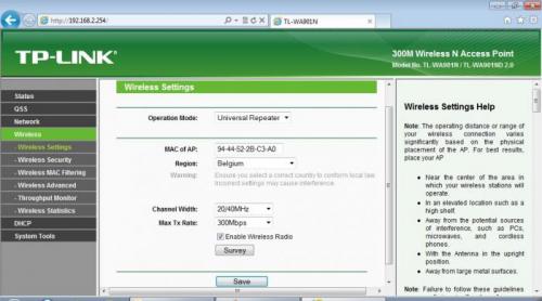 12. Beste experts, ik wil een TP-Link als repeater gebruiken op mijn Belkin N+ wireless router om het signaal naar de tuin toe te versterken. Handleiding gevolgd, ingelogd op TP-Link, weliswaar IP ingesteld op 192.168.2.1 omdat dit gateway van mijn router is. TP-Link vervolgens ingesteld als repeater (alsook universal repeater geprobeerd), verbinding gemaakt met mijn router zodat ik het MAC-adress zie en dan repeater reboot. Wanneer ik de TP-Link op zijn plaats zet, geeft hij echter geen signaal door naar pc's toe. Lampje "System" en "WLAN" blijven knipperen. Enige raad, hulp? Ik heb hier nogal een thread van gevonden maar deze is helaas gesloten en de oprichter geeft zijn oplossing niet prijs... http://www.pc-helpforum.be/f186/tp-link-tl-wa901nd-39205/ Alvast bedankt! Tom