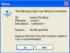 Hallo! Ik weet niet juist of ik wel in het juiste forum zit (dus als ik het topic verkeerd heb geplaats, sorry ) Ik wilde vandaag een .avi filmpje afspelen (van een tvserie), maar ik kreeg enkel geluid en geen beeld (met Windows Media Player en Media Player Classic geprobeerd). Ik dacht dus dat het een codec-probleem was, waardoor ik mijn oudere versie van K-Lite codec pack eraf heb gegooid en de nieuwste heb geïnstalleerd. Nu kreeg ik na de installatie van die nieuwe versie volgende melding: "The following codec was detected as broken: msacm.l3codecp" (zie ook afbeelding) Ik heb nog nooit problemen gehad met K-Lite codec pack en het gekke is dat Media Player Classic wél alle andere .avi bestandjes van die serie normaal kan afspelen... Het bestand is niet beschadigd, want op een andere pc speelt dit wel af... Kan iemand mij helpen? Alvast bedankt!