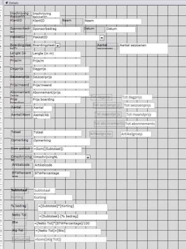 Ik ben een bepaalde database aan het maken. Nu, het zit zo: In deze database is er de mogelijk om de pakketten samen te stellen voor de klanten, de bedrijven die sponsoren dus. Dus stel: er is een bedrijf en dat sponsort 10000 euro. Dan wordt in het formulier frmInschrijvingPakket via een subformulier SubfrmInschijfinhoudPakket het pakket samengesteld. Elk artikel heeft een prijs. De optelling wordt dan gemaakt bij het kiezen van de verschillende artikelen in dat pakket (Bijv.: 2 keer een matchbal is dan 2 x 2500 euro, 1 x advertenties in de sportinger, is dan die prijs erbij, een beetje boarding bijv. en dan menu’s.) Menu kost normaal 46 euro en dan het aantal. De artikelen worden opgeteld en stel dat we aan een bedrag komen van 10870 euro (Bedrag Pakket). Dan krijgt die klant automatisch korting en dat wordt daarin gezet. Een korting verdeeld op al deze gekozen artikelen (elk evenveel), MAAR er mag GEEN korting op de menu’s worden gegeven. Dus dit mag niet in die berekening mee zitten. Het uiteindelijke bedrag dat moet betaald worden is sowieso dat sponsorbedrag van 10000 euro (uiteraard allemaal nog zonder btw). Dus op elk artikel komt een korting van zoveel %, die bedragen + het bedrag van de menu’s (zonder korting) moet dan aan 10 000 euro komen. Ik had al allerlei berekeningen gemaakt om dit te doen kloppen, met =IFF([Artikelgroep]=2;……), maar toch is er telkens iets verkeerd. NU denk ik dat het enkel echt kan kloppen als we dan het sponsorbedrag verminderen met het bedrag van de menu’s. Dat heb ik in Sponsorbedragmenu gezet. Maar dan zouden we het bedrag van het pakket ook moeten verminderen met het bedrag van de menu’s om deze berekening te kunnen laten kloppen. Maar daar is iets dat maar niet wil kloppen in mijn berekening. Wellicht is het met VB vrij snel op te lossen. Maar ik weet niet of dit op korte tijd is op te lossen.Ik had een oplossing, maar: Ik kan blijkbaar in een subformulier geen 1 query's samenvoegen --> dat lukt wel, maar dan kan ik mijn keuzelijsten daarin niet meer gebruiken! Het is kort dag? zou dit tegen morgen willen opgelost hebben. Wie heeft ideeën? Contacteer me en ik stuur de database via WeTransfer door. Het is moeilijk om mijn probleem hier uit te leggen. Ik zie dat er wel mensen komen kijken, maar dat er geen reacties binnenkomen, omdat mijn probleem wellicht niet concreet genoeg is. Als iemand toch echt wil helpen, please, stuur dan iets, ik doe het nodige om het concreet uit te leggen en te tonen. Maar ik kan mijn database hier niet tonen wegens te groot. Ik heb qryPakketInhoud Dit is de sql: SELECT tblInschrijfinhoudPakket.[inschrijving PakketID], tblInschrijvingPakket.Datum, tblKlanten.Naam, tblInschrijvingPakket.KlantID, tblArtikelen.OmschrijvingNL, tblInschrijfinhoudPakket.PakketID, tblArtikelen.Artikelcode, tblArtikelen.Verkoopprijs AS Dagprijs, tblArtikelen.Seizoenprijs, tblArtikelen.[Prijs/maand], tblArtikelen.[Abonnement/prijs], IIf([Dagprijs] Is Null,0,[Dagprijs]*[Aantal]) AS [Tot dagprijs], IIf([seizoenprijs] Is Null,0,[seizoenprijs]*[Aantal]) AS [Tot seizoenprijs], IIf([Prijs/maand] Is Null,0,[Prijs/maand]*[Aantal]) AS [Tot maandprijs], IIf([abonnement/prijs] Is Null,0,[Abonnement/prijs]*[Aantal/abon]) AS [Tot abonnementsprijs], tblInschrijfinhoudPakket.Aantal, tblInschrijfinhoudPakket.[Aantal/Abon], [Tot dagprijs]+[Tot seizoenprijs]+[Tot Maandprijs]+[Tot abonnementsprijs] AS Totaal, tblInschrijfinhoudPakket.Opmerking, tblInschrijfinhoudPakket.BoardingplaatsID, tblBoarding.[Prijs/m], tblBoarding.[Lengte (in m)], IIf([Prijs/m] Is Null,0,[Prijs/m]*[Lengte (in m)]) AS [Prijs boarding], [Totaal]+[Prijs Boarding] AS Subtotaal, tblArtikelen.BTWPercentage, [subtotaal]/100*[tblArtikelen.BTWPercentage] AS [btw-bedrag], tblInschrijvingPakket.[Aantal seizoenen], tblInschrijvingPakket.Sponsorbedrag, tblArtikelen.Artikelgroep, IIf([Artikelgroep]=2,[sponsorbedrag]-[subtotaal],0) AS SponsorbedragMenu, tblArtikelgroepen.[Korting toegelaten?] FROM tblArtikelgroepen INNER JOIN (tblArtikelen INNER JOIN (tblBoarding RIGHT JOIN ((tblKlanten INNER JOIN tblInschrijvingPakket ON tblKlanten.ID = tblInschrijvingPakket.KlantID) INNER JOIN tblInschrijfinhoudPakket ON tblInschrijvingPakket.[inschrijving PakketID] = tblInschrijfinhoudPakket.[inschrijving PakketID]) ON tblBoarding.BoardingID = tblInschrijfinhoudPakket.BoardingplaatsID) ON tblArtikelen.ID = tblInschrijfinhoudPakket.PakketID) ON tblArtikelgroepen.ID = tblArtikelen.Artikelgroep WHERE (((tblArtikelen.Artikelgroep)=1 Or (tblArtikelen.Artikelgroep)=2)); Maar dan heb ik in SubfrmInschrijfinhoudPakket: subfrm.jpg Maar daar zit dus de fout! Eigenlijk heb ik volgende zaken hierbij nodig: Uit qryTotalenPAkketZonderMenu’s: qry1.jpg Dit geeft de juiste procenten weer van wat van elk artikel mag worden afgetrokken. MAAR dit mag niet op artikels uit artikelgroep 2 (dus menu’s e.d.) qryTotalenPakektZonderMenu’s is gebaseerd op qryBedragenZonderMenu’sTest qry2.jpg Nu: ik had beide query’s: qryPakketInhoud en qryTotalenPakketZonderMenu’s samen in een subformulier gezet. Dit kon me de juiste %-en bezorgen. Maar dan werken mijn keuzelijsten daarin niet. Dus dat is geen optie. Op de moment heb ik al zovele berekeningen en zaken gedaan, dat ik het ofwel te moeilijk aan het maken ben nu. Eigenlijk zou ik in qryPakketInhoud moeten kunnen zeggen dat er korting wordt berekend op alles behalve op de menu’s. Dus we hebben daar dan een Totaal pekket, en een Sponsorbedrag. Dus da’s moet dat Sponsorbedrag – het bedrag van de menu’s gaan en het totale pakket ook – bedrag van de menu’s. En dan wordt het aantal % berekend via dat (zie bijv. frmOverzichtPakkettenKlanten daar staat aantal % juist in)….. maar als er een menu wordt gekozen in de lijst, dan moet het % bedrag altijd 0 zijn. Dan is er geen korting. Hopelijk is dit iets duidelijker. Bedankt! Bedankt!