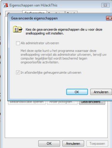 Ik had SuperAntiSpyware gedownload en die zei dat het om een Trojaans paard ging, file verwijderd, pc terug opgestart maar de 2 bestanden zitten nog steeds in mijn roaming map. Ik heb Hijackthis nu gedownload maar ik kan het bestand niet als administrator uitvoeren, als ik op de rechtermuisknop druk is die functie niet zichtbaar voor mij. Shotje: - - - Updated - - - Ohja en bij eigenschappen kan ik het niet aanklikken: -