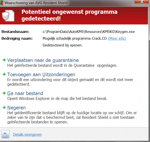 de laatste dagen zit ik met een klein probleempje, elke keer als ik mijn pc opstart krijg ik een melding van AVG (internet security 2011) dat er potentieel gevaar zit in een file keygen.exe (c:\ProgramData\AutoKMS\resources\KMSKG\Keygen.exe) ik vind echter hiervan geen spoor in mijn opstart gegevens (msconfig en tuneup 2011) en kan het opstarten ervan niet wegkrijgen, de file zelf heb ik al talloze keren verwijderd. na een volledig scan van mijn avg zijn er 2 bestanden in de map die hij gevaarlijk vindt en wilt verwijderen hellaas als ik op werwijderen klik crasht mijn pc. Enig idee hoe ik dit probleem oplos? alvast bedankt indien nodig, hier is een HJT logje Logfile of Trend Micro HijackThis v2.0.4 Scan saved at 13:20:31, on 25/05/2011 Platform: Windows 7 (WinNT 6.00.3504) MSIE: Internet Explorer v8.00 (8.00.7600.16766) Boot mode: Normal Running processes: C:\Program Files (x86)\Vuze\Azureus.exe C:\Program Files (x86)\NEC Electronics\USB 3.0 Host Controller Driver\Application\nusb3mon.exe C:\Program Files (x86)\System Control Manager\MGSysCtrl.exe C:\Program Files (x86)\AVG\AVG10\avgtray.exe C:\Program Files (x86)\MSI\msi LED Manager\SLM.exe C:\Program Files (x86)\AVG\AVG10\Identity Protection\agent\bin\avgidsmonitor.exe C:\Program Files (x86)\Mozilla Firefox\firefox.exe C:\Program Files\Motorola\Bluetooth\btplayerctrl.exe C:\Program Files (x86)\Mozilla Firefox\plugin-container.exe C:\Users\Sam\Downloads\HijackThis.exe R1 - HKCU\Software\Microsoft\Internet Explorer\Main,Default_Page_URL = MSI | MSN R1 - HKCU\Software\Microsoft\Internet Explorer\Main,Search Page = Bing R0 - HKCU\Software\Microsoft\Internet Explorer\Main,Start Page = MSI | MSN R1 - HKLM\Software\Microsoft\Internet Explorer\Main,Default_Page_URL = Hotmail, Messenger, nieuws en entertainment vind je op MSN.nl R1 - HKLM\Software\Microsoft\Internet Explorer\Main,Default_Search_URL = Bing R1 - HKLM\Software\Microsoft\Internet Explorer\Main,Search Page = Bing R0 - HKLM\Software\Microsoft\Internet Explorer\Main,Start Page = Hotmail, Messenger, nieuws en entertainment vind je op MSN.nl R0 - HKLM\Software\Microsoft\Internet Explorer\Search,SearchAssistant = R0 - HKLM\Software\Microsoft\Internet Explorer\Search,CustomizeSearch = R0 - HKLM\Software\Microsoft\Internet Explorer\Main,Local Page = C:\Windows\SysWOW64\blank.htm R1 - HKCU\Software\Microsoft\Windows\CurrentVersion\Internet Settings,ProxyOverride = *.local R0 - HKCU\Software\Microsoft\Internet Explorer\Toolbar,LinksFolderName = R3 - URLSearchHook: AVG Security Toolbar BHO - {A3BC75A2-1F87-4686-AA43-5347D756017C} - C:\Program Files (x86)\AVG\AVG10\Toolbar\IEToolbar.dll F2 - REG:system.ini: UserInit=userinit.exe O2 - BHO: AcroIEHelperStub - {18DF081C-E8AD-4283-A596-FA578C2EBDC3} - C:\Program Files (x86)\Common Files\Adobe\Acrobat\ActiveX\AcroIEHelperShim.dll O2 - BHO: WormRadar.com IESiteBlocker.NavFilter - {3CA2F312-6F6E-4B53-A66E-4E65E497C8C0} - C:\Program Files (x86)\AVG\AVG10\avgssie.dll O2 - BHO: Groove GFS Browser Helper - {72853161-30C5-4D22-B7F9-0BBC1D38A37E} - C:\PROGRA~2\MICROS~1\Office14\GROOVEEX.DLL O2 - BHO: Aanmeldhulp voor Windows Live ID - {9030D464-4C02-4ABF-8ECC-5164760863C6} - C:\Program Files (x86)\Common Files\Microsoft Shared\Windows Live\WindowsLiveLogin.dll O2 - BHO: AVG Security Toolbar BHO - {A3BC75A2-1F87-4686-AA43-5347D756017C} - C:\Program Files (x86)\AVG\AVG10\Toolbar\IEToolbar.dll O2 - BHO: SkypeIEPluginBHO - {AE805869-2E5C-4ED4-8F7B-F1F7851A4497} - C:\Program Files (x86)\Skype\Toolbars\Internet Explorer\skypeieplugin.dll O2 - BHO: URLRedirectionBHO - {B4F3A835-0E21-4959-BA22-42B3008E02FF} - C:\PROGRA~2\MICROS~1\Office14\URLREDIR.DLL O2 - BHO: Java Plug-In 2 SSV Helper - {DBC80044-A445-435b-BC74-9C25C1C588A9} - C:\Program Files (x86)\Java\jre6\bin\jp2ssv.dll O3 - Toolbar: AVG Security Toolbar - {CCC7A320-B3CA-4199-B1A6-9F516DD69829} - C:\Program Files (x86)\AVG\AVG10\Toolbar\IEToolbar.dll O4 - HKLM\..\Run: [NUSB3MON] "C:\Program Files (x86)\NEC Electronics\USB 3.0 Host Controller Driver\Application\nusb3mon.exe" O4 - HKLM\..\Run: [MGSysCtrl] C:\Program Files (x86)\System Control Manager\MGSysCtrl.exe O4 - HKLM\..\Run: [AVG_TRAY] C:\Program Files (x86)\AVG\AVG10\avgtray.exe O4 - HKLM\..\Run: [msi LED Manager] C:\Program Files (x86)\msi\msi LED Manager\SLM.exe O4 - HKCU\..\Run: [Azureus] C:\Program Files (x86)\Vuze\Azureus.exe O4 - HKUS\S-1-5-19\..\Run: [sidebar] %ProgramFiles%\Windows Sidebar\Sidebar.exe /autoRun (User 'LOCAL SERVICE') O4 - HKUS\S-1-5-19\..\RunOnce: [mctadmin] C:\Windows\System32\mctadmin.exe (User 'LOCAL SERVICE') O4 - HKUS\S-1-5-20\..\Run: [sidebar] %ProgramFiles%\Windows Sidebar\Sidebar.exe /autoRun (User 'NETWORK SERVICE') O4 - HKUS\S-1-5-20\..\RunOnce: [mctadmin] C:\Windows\System32\mctadmin.exe (User 'NETWORK SERVICE') O8 - Extra context menu item: &Verzenden naar OneNote - res://C:\PROGRA~2\MICROS~1\Office14\ONBttnIE.dll/105 O8 - Extra context menu item: E&xporteren naar Microsoft Excel - res://C:\PROGRA~2\MICROS~1\Office14\EXCEL.EXE/3000 O8 - Extra context menu item: Free YouTube to MP3 Converter - C:\Users\Sam\AppData\Roaming\DVDVideoSoftIEHelpers\freeyoutubetomp3converter.htm O9 - Extra button: Send to OneNote - {2670000A-7350-4f3c-8081-5663EE0C6C49} - C:\Program Files (x86)\Microsoft Office\Office14\ONBttnIE.dll O9 - Extra 'Tools' menuitem: Se&nd to OneNote - {2670000A-7350-4f3c-8081-5663EE0C6C49} - C:\Program Files (x86)\Microsoft Office\Office14\ONBttnIE.dll O9 - Extra button: OneNote Lin&ked Notes - {789FE86F-6FC4-46A1-9849-EDE0DB0C95CA} - C:\Program Files (x86)\Microsoft Office\Office14\ONBttnIELinkedNotes.dll O9 - Extra 'Tools' menuitem: OneNote Lin&ked Notes - {789FE86F-6FC4-46A1-9849-EDE0DB0C95CA} - C:\Program Files (x86)\Microsoft Office\Office14\ONBttnIELinkedNotes.dll O9 - Extra button: Skype Plug-In - {898EA8C8-E7FF-479B-8935-AEC46303B9E5} - C:\Program Files (x86)\Skype\Toolbars\Internet Explorer\skypeieplugin.dll O9 - Extra 'Tools' menuitem: Skype Plug-In - {898EA8C8-E7FF-479B-8935-AEC46303B9E5} - C:\Progra