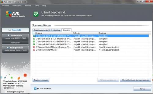 de map c:\programdata\autoKMS bestaat nog altijd (net als zijn inhoud) heb hem dan maar manueel verwijderd. c\windows\AutoKMS is wel weg en ik krijg bij het opstarten het waarschuwingsbericht niet meer hier is het anti-malware logje Malwarebytes' Anti-Malware 1.50.1.1100 Malwarebytes : Free anti-malware, anti-virus and spyware removal download Databaseversie: 6674 Windows 6.1.7600 Internet Explorer 8.0.7600.16385 25/05/2011 16:17:12 mbam-log-2011-05-25 (16-17-12).txt Scantype: Snelle scan Objecten gescand: 159797 Verstreken tijd: 4 minuut/minuten, 27 seconde(n) Geheugenprocessen geïnfecteerd: 0 Geheugenmodulen geïnfecteerd: 0 Registersleutels geïnfecteerd: 0 Registerwaarden geïnfecteerd: 0 Registerdata geïnfecteerd: 0 Mappen geïnfecteerd: 0 Bestanden geïnfecteerd: 1 Geheugenprocessen geïnfecteerd: (Geen kwaadaardige objecten gedetecteerd) Geheugenmodulen geïnfecteerd: (Geen kwaadaardige objecten gedetecteerd) Registersleutels geïnfecteerd: (Geen kwaadaardige objecten gedetecteerd) Registerwaarden geïnfecteerd: (Geen kwaadaardige objecten gedetecteerd) Registerdata geïnfecteerd: (Geen kwaadaardige objecten gedetecteerd) Mappen geïnfecteerd: (Geen kwaadaardige objecten gedetecteerd) Bestanden geïnfecteerd: c:\Windows\AutoKMS.exe (RiskWare.Tool.CK) -> Quarantined and deleted successfully. en een nieuw HJT logje Logfile of Trend Micro HijackThis v2.0.4 Scan saved at 16:29:39, on 25/05/2011 Platform: Windows 7 (WinNT 6.00.3504) MSIE: Internet Explorer v8.00 (8.00.7600.16766) Boot mode: Normal Running processes: C:\Program Files (x86)\Vuze\Azureus.exe C:\Program Files (x86)\NEC Electronics\USB 3.0 Host Controller Driver\Application\nusb3mon.exe C:\Program Files (x86)\System Control Manager\MGSysCtrl.exe C:\Program Files (x86)\AVG\AVG10\avgtray.exe C:\Program Files (x86)\MSI\msi LED Manager\SLM.exe C:\Program Files (x86)\AVG\AVG10\Identity Protection\agent\bin\avgidsmonitor.exe C:\Program Files\Motorola\Bluetooth\btplayerctrl.exe C:\Program Files (x86)\Mozilla Firefox\firefox.exe C:\Program Files (x86)\Mozilla Firefox\plugin-container.exe C:\Program Files (x86)\Malwarebytes' Anti-Malware\mbam.exe C:\Users\Sam\Downloads\HijackThis.exe R1 - HKCU\Software\Microsoft\Internet Explorer\Main,Default_Page_URL = MSI | MSN R1 - HKCU\Software\Microsoft\Internet Explorer\Main,Search Page = Bing R0 - HKCU\Software\Microsoft\Internet Explorer\Main,Start Page = MSI | MSN R1 - HKLM\Software\Microsoft\Internet Explorer\Main,Default_Page_URL = Hotmail, Messenger, nieuws en entertainment vind je op MSN.nl R1 - HKLM\Software\Microsoft\Internet Explorer\Main,Default_Search_URL = Bing R1 - HKLM\Software\Microsoft\Internet Explorer\Main,Search Page = Bing R0 - HKLM\Software\Microsoft\Internet Explorer\Main,Start Page = Hotmail, Messenger, nieuws en entertainment vind je op MSN.nl R0 - HKLM\Software\Microsoft\Internet Explorer\Search,SearchAssistant = R0 - HKLM\Software\Microsoft\Internet Explorer\Search,CustomizeSearch = R0 - HKLM\Software\Microsoft\Internet Explorer\Main,Local Page = C:\Windows\SysWOW64\blank.htm R1 - HKCU\Software\Microsoft\Windows\CurrentVersion\Internet Settings,ProxyOverride = *.local R0 - HKCU\Software\Microsoft\Internet Explorer\Toolbar,LinksFolderName = R3 - URLSearchHook: AVG Security Toolbar BHO - {A3BC75A2-1F87-4686-AA43-5347D756017C} - C:\Program Files (x86)\AVG\AVG10\Toolbar\IEToolbar.dll F2 - REG:system.ini: UserInit=userinit.exe, O2 - BHO: AcroIEHelperStub - {18DF081C-E8AD-4283-A596-FA578C2EBDC3} - C:\Program Files (x86)\Common Files\Adobe\Acrobat\ActiveX\AcroIEHelperShim.dll O2 - BHO: WormRadar.com IESiteBlocker.NavFilter - {3CA2F312-6F6E-4B53-A66E-4E65E497C8C0} - C:\Program Files (x86)\AVG\AVG10\avgssie.dll O2 - BHO: Groove GFS Browser Helper - {72853161-30C5-4D22-B7F9-0BBC1D38A37E} - C:\PROGRA~2\MICROS~1\Office14\GROOVEEX.DLL O2 - BHO: Aanmeldhulp voor Windows Live ID - {9030D464-4C02-4ABF-8ECC-5164760863C6} - C:\Program Files (x86)\Common Files\Microsoft Shared\Windows Live\WindowsLiveLogin.dll O2 - BHO: AVG Security Toolbar BHO - {A3BC75A2-1F87-4686-AA43-5347D756017C} - C:\Program Files (x86)\AVG\AVG10\Toolbar\IEToolbar.dll O2 - BHO: SkypeIEPluginBHO - {AE805869-2E5C-4ED4-8F7B-F1F7851A4497} - C:\Program Files (x86)\Skype\Toolbars\Internet Explorer\skypeieplugin.dll O2 - BHO: URLRedirectionBHO - {B4F3A835-0E21-4959-BA22-42B3008E02FF} - C:\PROGRA~2\MICROS~1\Office14\URLREDIR.DLL O2 - BHO: Java Plug-In 2 SSV Helper - {DBC80044-A445-435b-BC74-9C25C1C588A9} - C:\Program Files (x86)\Java\jre6\bin\jp2ssv.dll O3 - Toolbar: AVG Security Toolbar - {CCC7A320-B3CA-4199-B1A6-9F516DD69829} - C:\Program Files (x86)\AVG\AVG10\Toolbar\IEToolbar.dll O4 - HKLM\..\Run: [NUSB3MON] "C:\Program Files (x86)\NEC Electronics\USB 3.0 Host Controller Driver\Application\nusb3mon.exe" O4 - HKLM\..\Run: [MGSysCtrl] C:\Program Files (x86)\System Control Manager\MGSysCtrl.exe O4 - HKLM\..\Run: [AVG_TRAY] C:\Program Files (x86)\AVG\AVG10\avgtray.exe O4 - HKLM\..\Run: [msi LED Manager] C:\Program Files (x86)\msi\msi LED Manager\SLM.exe O4 - HKCU\..\Run: [Azureus] C:\Program Files (x86)\Vuze\Azureus.exe O4 - HKUS\S-1-5-19\..\Run: [sidebar] %ProgramFiles%\Windows Sidebar\Sidebar.exe /autoRun (User 'LOCAL SERVICE') O4 - HKUS\S-1-5-19\..\RunOnce: [mctadmin] C:\Windows\System32\mctadmin.exe (User 'LOCAL SERVICE') O4 - HKUS\S-1-5-20\..\Run: [sidebar] %ProgramFiles%\Windows Sidebar\Sidebar.exe /autoRun (User 'NETWORK SERVICE') O4 - HKUS\S-1-5-20\..\RunOnce: [mctadmin] C:\Windows\System32\mctadmin.exe (User 'NETWORK SERVICE') O8 - Extra context menu item: &Verzenden naar OneNote - res://C:\PROGRA~2\MICROS~1\Office14\ONBttnIE.dll/105 O8 - Extra context menu item: E&xporteren naar Microsoft Excel - res://C:\PROGRA~2\MICROS~1\Office14\EXCEL.EXE/3000 O8 - Extra context menu item: Free YouTube to MP3 Converter - C:\Users\Sam\AppData\Roaming\DVDVideoSoftIEHelpers\freeyoutubetomp3converter.htm O9 - Extra button: Send to OneNote - {2670000A-7350-4f3c-8081-5663EE0C6C49} - C:\Program Files (x86)\Microsoft Office\Office