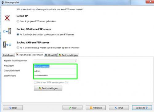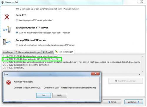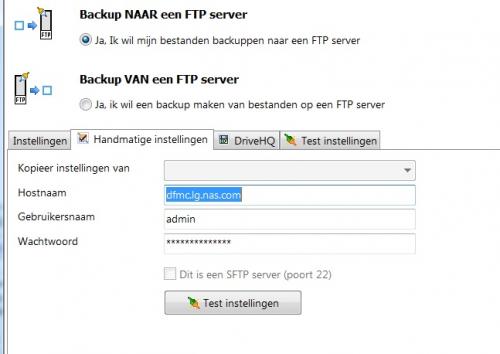 Ik heb een NAS-server van JG die ik via internet kan benaderen. Hiervoor ga ik naar "mijn eigen website" en log met een username en wachtwoord in. Hierdoor kan ik bij de bestanden op mijn NAS-server. Nu heb ik ook een back-up programma (SynckbackSE) die de mogelijkheid heeft om te back-uppen op een ftp-server (lees NAS-server). Je ziet in de logfile dat er verbinding wordt gemaakt maar daarna blijft wachten. Het lijkt erop dat het programma kijkt naar de verkeerde poort maar zeker weten doe ik het niet daar er naar mijn idee geen verbinding gemaakt zou moeten worden. Tevens kan ik geen optie vinden om de benodige poort te wijzigen. Wie kan mij helpen -