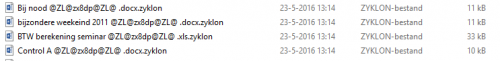 Hallo, een vriend van mij heeft een probleem met zijn pc. Alle bestanden zoals, docx, jpg, htm enz enz. zijn allemaal hernoemd naar bestandsnaam.@ZL@zx8dp@ZL@ .docx.zyklon (dit is een vb van een docx bestand). Ik heb gezocht op internet en daar vind ik dat dit iets te maken heeft met een virus. Vraag is nu hoe krijg ik deze pc weer schoon en hoe kan ik de bestanden deencrypten zodat ik ze weer gebruiken kan???? BVD Peter -