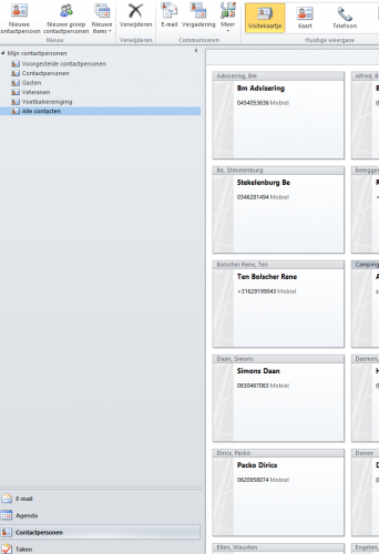 Hallo, Ik probeer de outlook contactgegevens (adresbroek) over te zetten maar dat lukt niet helemaal. Ik heb een kopie gemaakt op de oude pc en geimporteerd op de nieuwe. Dit gaat helaas niet zoals ik het gedacht had. Ik krijg de contactpersonen niet te zien als ik in een mail op "AAN" klik. Als ik echter naar het tab contactpersonen ga dan zie ik ze daar allemaal staan. Ik krijg ze dus op de een of andere manier niet gekoppeld. Wat doe ik fout? Office 2010 Zie bijlagen 1 en 2 Gr. Peter