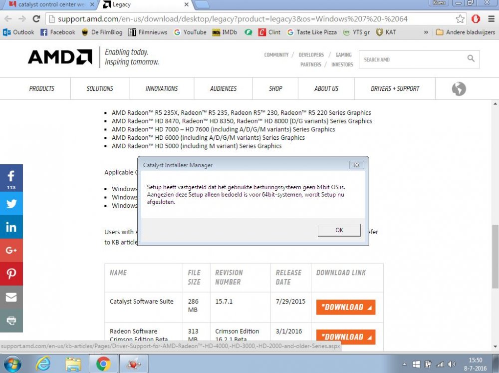 Na wat zoeken, proberen en ook een beetje vloeken is het probleem opgelost! Op de AMD site heb je een tool die zelf zoekt welke driver het meest geschikt is voor jouw pc. Deze gewoon eens laten lopen en ik kwam op dezelfde driver uit die jij al aangaf, MAAR de 32bit versie. Deze kon ik dus wel probleemloos installeren en alles werkt terug zoals het hoort. Zal even de link posten voor moesten er andere met hetzelfde probleem zitten : Automatically Detect and Install Your Driver Bedankt voor de hulp Stegistoft, al is de echte oplossing door AMD zelf gegeven Dit mag dit hier voor mij gesloten worden.