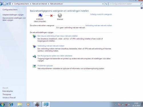 Win 7 prof stond op usb stick die ik van collega heb gekregen, samen met een opstart programma om tot aan het windows installatie scherm te geraken. Vanwaar hij ermee komt weet ik ook niet, de installatie in op de nieuwe harde schijf is probleemloos verlopen. het enige probleem dat ik nu dus nog heb is dat het internet niet wil werken. Speccy, netwerk: Netwerk U bent niet verbonden met het internet Computernaam NetBIOS-naam KOEN-PC DNS-naam Koen-PC Lidmaatschap Onderdeel van werkgroep Werkgroep WORKGROUP Remote desktop Uitgeschakeld Console Staat Actief Domein Koen-PC WinInet info Het lokale systeem heeft RAS om verbinding te maken met het internet Wi-Fi info Wi-Fi is niet ingeschakeld WinHTTPInfo WinHTTPSessionProxyType Geen proxy Session Proxy Session Proxy omzeiling Aansluitpogingen 5 Aansluit time-out 60.000 HTTP versie HTTP 1.1 Maximale connecties per 1.0 servers Oneindig Maximale connecties per servers Oneindig Maximale HTTP automatische doorverwijzingen 10 Maximale HTTP status verdergaan 10 Verzend time-out 30.000 IEProxy automatische detectie Ja IEProxy automatische configuratie IEProxy IEProxy omzeiling Standaard proxyconfiguratie toegangstype Geen proxy Standaardconfiguratie proxy Standaardconfiguratie proxy omzeiling Delen en ontdekking Netwerk ontdekking Uitgeschakeld Bestand en printer delen Uitgeschakeld Bestands- en printerdelingservice Niet geïnstalleerd Eenvoudige bestandsdeling Ingeschakeld Administratieve delen Ingeschakeld Netwerktoegang: model voor delen en beveiliging voor lokale accounts Klassiek - lokale gebruikers als zichzelf verifiëren Adapterlijst Ingeschakeld Bluetooth-apparaat (Personal Area Network) Verbindingsnaam Bluetooth-netwerkverbinding DHCP ingeschakeld Ja MAC-adres 74-2F-68-CF-12-24 Netwerk delen No network shares Bij netwerkcentrum zie ik het volgende : bij apparaatbeheer :