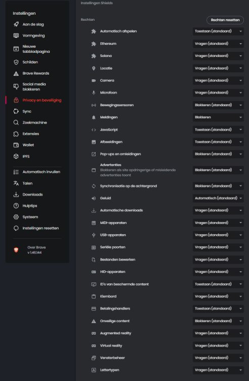 Hierbij ook nog de instellingen in brave browser. Ik heb ook alles wat op "geblokkeerd" stond even op toestaan gezet. De pagina opnieuw geladen maar geen effect.