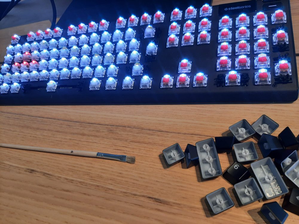 voordat je concludeert dat ie kapot is: - er blijft een toets hangen dus uit- en inpluggen heeft geen nut, evenals software eraf en erop. -> ik heb de toest er al is afgehaald, niets aan te zien. De "f" toets werkt ook gewoon goed. En als ik een lange tijd aan het typen ben, zoals nu, dan komt er geen enkele "f" verkeerd tussen. Vreemd.f - zie je iets aan die toets -> nee, ziet er prima uit. - op de kop houden en flink schuddenfff -> ik heb alle toetsen eraf gehaald en alles afgeborsteld, uitgeblazen... probleem blijft zich voordoen. - is er cola oid overheen gegaan? -> nee, niets speciaal. Gewoon van de ene dag op de andere.f - ligt er iets op het toetsenbord -> nee. - als het demontabel is kan je de toetsensectie losmaken en reinigen -> heb ik ondertussen gedaan. Zat een beetje stof tussen maar al bij al niet echt vuil. Zou ik misschien zo een wit knopje eraf kunnen halen en dit vervangen door een ander knopje? Bijvoorbeeld de F6 die ik toch nooit gebruik? -