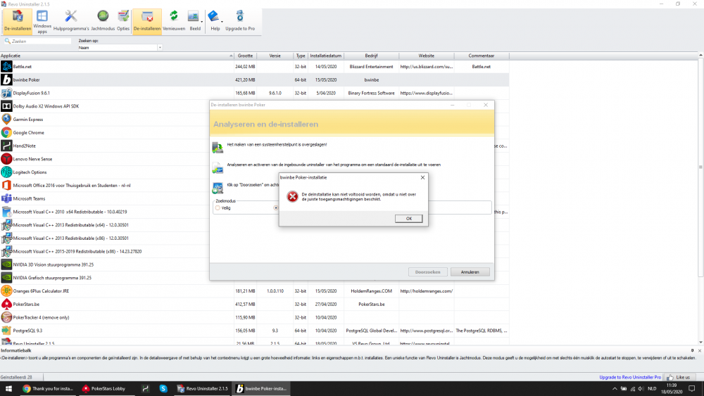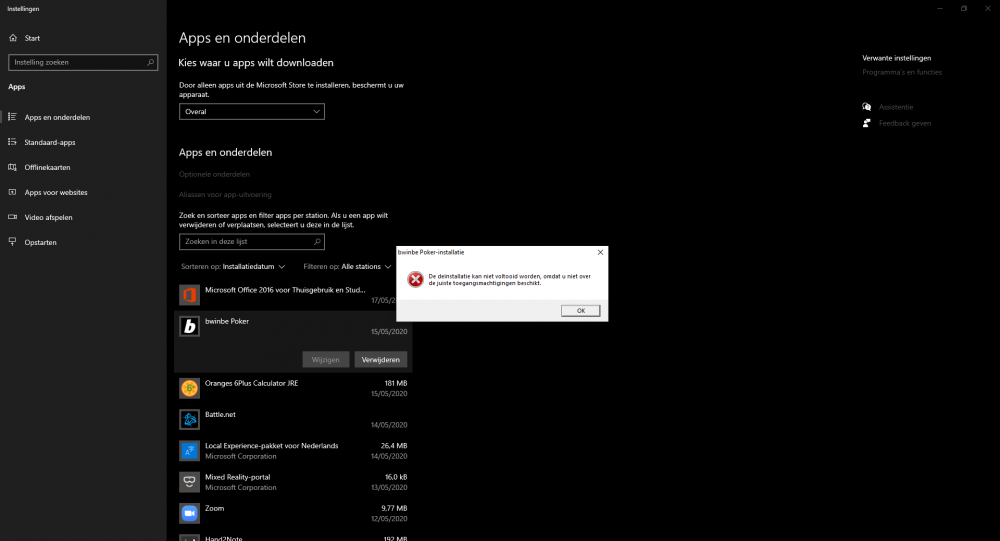 Beste, nog nooit problemen gehad met het verwijderen van software. Nu wel met deze van BWIN. Kan iemand me helpen? Ik zou denken dat ik admin ben van de pc. Eventueel even uitleggen waar ik dit kan nakijken of instellen zodat ik dit in de toekomst niet meer voor heb. Afbeelding met foutmelding in bijlage. Zou u ook een linkje kunnen geven naar pc tools ivm opruimen slechte bestanden en scannen van de pc op malware en dergelijke? Alvast bedankt.