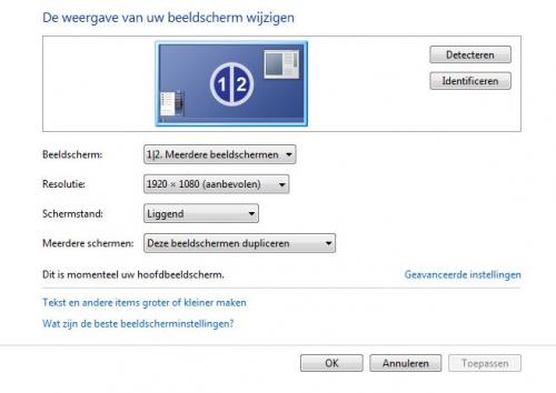 20. misschien had u toch gelijk over die 2 schermen, ik was de instelling aan het veranderen, en toen ik het zo instelde ging de hdmi wel: komt dit doordat ik de dvi kabel en de hdmi kabel aan de pc heb aangesloten?