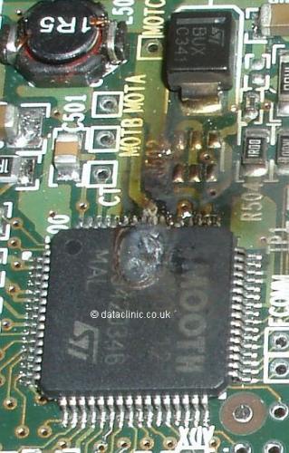 10. Schijf defect, dat kan de USB controller zijn of de motor driver IC. Ik ken iemand die werkt in het bedrijf van deze chips. foto van een defecte motor driver IC: