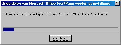 Het is gaat niet over functies die bij het eerste gebruik geïnstalleerd worden. Office is volledig geïnstalleerd. Er wordt nooit achter een cd gevraagd. De progressbar gaat ook telkens tot 100% en dan start FrontPage verder op en werkt normaal. Als ik dan na gebruik het document save en FrontPage afsluit en later terug opstart met hetzelfde document opnieuw open komen die schermen terug.