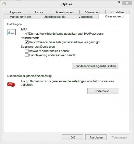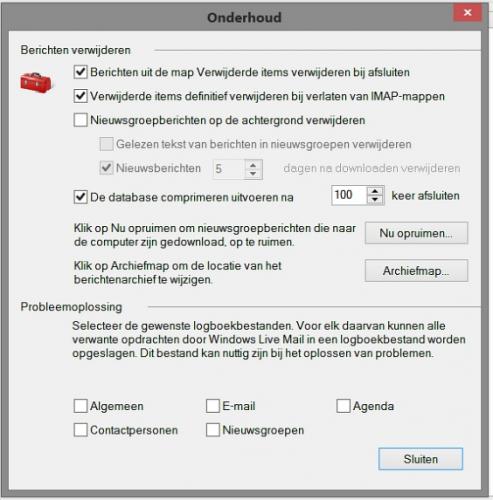 Ik heb een Telenet (IMAP) mailadres en gebruik Windows live mail.Verwijderde mail gaat naar der map verwijderde items en die word leeggemaakt bij het afsluiten van het programma.Echter die verwijderde mail blijft op de server zitten in de map trash. Mijn instellingen zijn correct ,verwijderde items definitief verwijderen bij het verlaten van IMAP mappen is aangevinkt,maar toch gebeurt dit niet. De technische dienst van Telenet kan geen oplossing vinden omdat het via de webmail wel goed gaat. Wat kan ik doen om de verwijderde items definitief van de server te krijgen als ik afsluit?Want telkens inloggen via webmail is niet echt handig en al die berichten worden ook steeds weer opnieuw binnengehaald als ik de map trash in Windows live mail ledig. Ik heb het programma al eens verwijderd en opnieuw geïnstalleerd maar dat gaf geen oplossing.