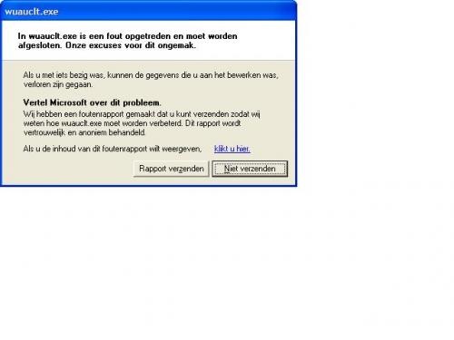 Inderdaad, altijd maar dezelfde foutmelding "wuauclt.exe" zodra de pc opstart. Komt om de x seconden terug. Rapport versturen (?) of niet, geeft nooit een verschil. Je hebt waarschijnlijk wel de roman gelezen die deze vierde bladzijde voorafgaat? Dank voor het zoeken naar een oplossing. Ik ben het wegklikken van de foutmelding grondig beu....