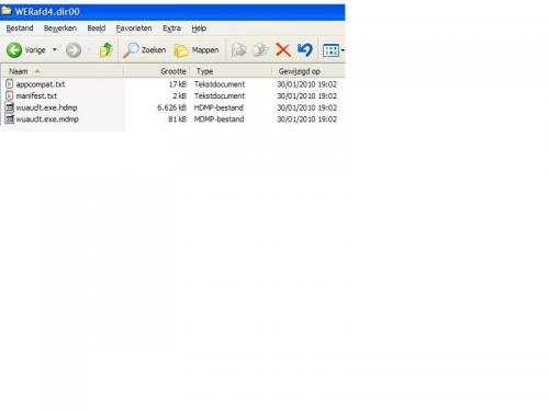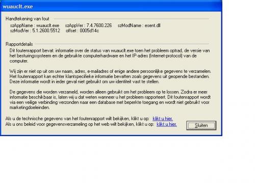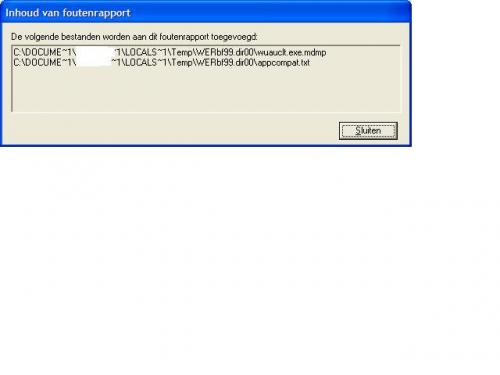 Uiteraard ook mijn dank aan kweezie wabbit (sorry voor de typfout in je naam in de reactie aan Angel). Hierna hoop ik de screenshots te kunnen toevoegen, ook al heb ik dit nog nooit gedaan. Ze volgen elkaar op, na het gebruik van de link "Klik hier" en het openen van de errormap zelf. De nummers na "WER" zijn bij elke foutmelding anders; Dus de screenshots zijn niet van dezelfde foutmelding. Wellicht idem in de "txt"-mappen Via "zoeken" heb ik gevonden dat de "wuauclt.exe" voorkomt in C:/WINDOWS/ in de ondermappen i386, Prefetch, systeem32, ERDTN/cache, service packs/i386 Ik durf zo maar niet in die wellicht belangrijke mappen, de "exe" wijzigen in "ex0" Daarvoor reikt mijn pc-kennis niet ver genoeg! Ten slotte, terwijl ik dit typ, GEEN FOUTMELDINGEN. Wat een verademing!!! Maar of de (voor mij zo mooie) oplossing van Angel mag blijven, baart mij zorgen. Wat kan een foutieve "wuauclt.exe" en later misschien een andere haperende toepassing, voor onheil uitrichten als er niets aan gedaan wordt??? Is "Wat niet weet niet deert" een leidmotief, of een lijdmotief? Nogmaals dank voor je gewaardeerde hulp. Lucky P.S. Ik stuur je alvast dit bericht. Met "kopiëren" en "plakken" de vier "bmp" en de twee "txt"mapjes hieraan toevoegen lukt niet. Ik zoek wel op hoe het moet...