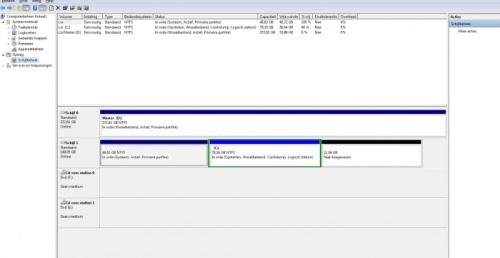 Schijf 1, is de betreffende schijf: 149,05GB Online: onderverdeeld in: 48,83GB NTFS In Orde (Systeem, Actief, Primaire partitie) (C:)79,16GB NTFS In orde (Opstarten, Wisselbestand, Crashdump, Logisch station) 21.06Gb Niet-toegewezen Hopelijk is deze informatie genoeg... Grts