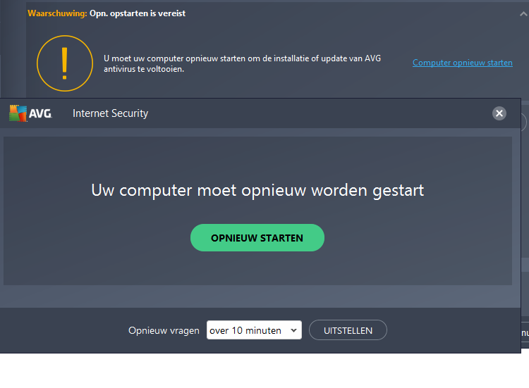 Hoi Calvus Ja ik had na de volledige verwijdering van AVG (alle stappen overlopen die je me hebt gegeven) de AVG free erop gezet. Na een eerste herstart van de pc, op vraag van AVG heb ik een volledige scan gedaan, up to date bijgewerkt en geplande scans ingesteld etc. Dit verliep prima tot ik de pc deze morgend terug op gezet had en plots weer een herstart van AVG wegens "je protectie is niet volledig, computer moet terug herop gestart worden" -> vervolgens vraagt hij ook een herstart met de keuze 10 min, 20 min etc... uitstel. En dit blijft AVG doen, een vicieuze cirkel m.a.w.. Sorry dat ik vervelend ga doen maar ik heb AVG er volledig afgegooid en Kaspersky Free geïnstalleerd. Wel heel hard bedankt voor je hulp, zowel jij als de rest.