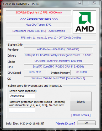Ik heb deze test eens gedaan met alles aangevinkt op 1080p 4xmsaa en fullscreen. (stress test) Mijn gpu bereikte na enkele minuten 95°c, toen ik de software wou stuiten met escape blokkeerde de software (dit programma reageert niet meer en moet worden afgesloten). Ook heb ik eens de gewone 1080p preset gedaan en de resultaten staan in bijlage 1