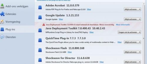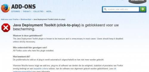 Heb vanmorgen nog een geprobeert Java opnieuw te installeren (eerst alles verwijderen) maar kreeg weer dezelfde boodschap dat bij controle niet bevestigd kon worden dat het goed is gebeurd. Na wat zoekwerk ontdekte ik dat het probleem in Mozilla Firefox zit . Bij Extra - Add-ons staat Mozilla de knop 'vragen om te activeren' en ik kan deze niet wijzigen. Is dit een probleem en zo ja hoe kan ik dit verhelpen ? -