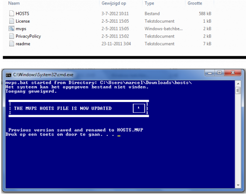 Ik heb het MVPS Hosts zip bestand opgeslagen en uitgepakt. Vervolgens heb ik het mvps.bat bestand als administrator uitgevoerd. en toen kreeg ik het volgende te zien: Ik heb toen op een willekeurige toets gedrukt en toen was het scherm weg.