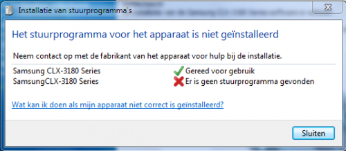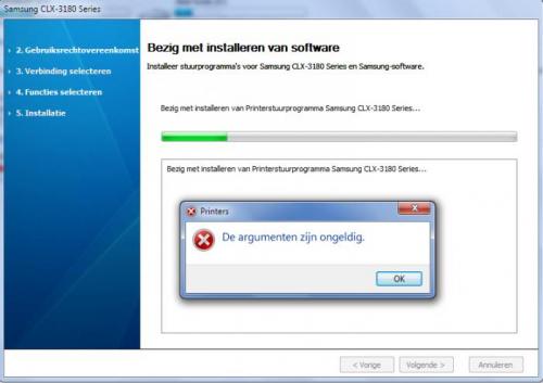 Beste PCH, Ik heb mij een nieuwe printer aangeschaft (Samsung CLX-3180) die ik op mijn desktop wil installeren. Ik krijg steeds meldingen dat ik de software niet kan installeren (foto1) " de argumenten zijn ongeldig" Verder "het stuurprogramma voor dit apparaat is niet geinstalleerd" (foto2) En als ik een printer wil toevoegen (foto3) "Kan printer toevoegen niet openen De lokale Print Spooler-service wordt niet uitgevoerd. Start de spooler opnieuw of start de computer opnieuw op" Mijn computer draad op Win7. Op mijn Laptop met Vista GEEN probleem alles werkt uitstekent Wie kan er mij helpen? grtn djdanvan Ook nu op computer WinXP geplaatst en alles OK