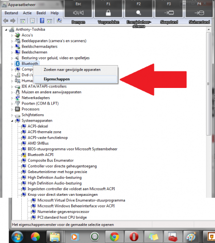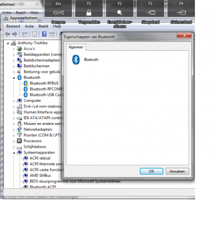 15. Als ik bij apparaatbeheer rechtsklik op het "hoofd"-bluetooth-icoon (zie afbeelding 1 hieronder) en dan naar eigenschappen ga, zie ik dit (zie afbeelding 2 hieronder): ik kan echter wel met de linkermuisknop klikken op het bluetooth icoon, en dan kom ik bij 3 verschillende andere opties, welke van de 3 moet ik dan nemen? Bluetooth RFBUS, Bluetooth RFCOMM of Bluetooth USB-controller-10 from Toshiba? - - - Updated - - - TOEVOEGING: ik zal al bij alle 3 de opties zeggen wat ik krijg als ik naar details ga en dan hardware-ID kies: bij Bluetooth RFBUS krijg ik dit: Bluetooth\tosrfbd bij Bluetooth RFCOMM dit: root\blootooth_com en bij Bluetooth USB-controller-10 from Toshiba dit: USB\VID_0930&PID_0215&REV_0001