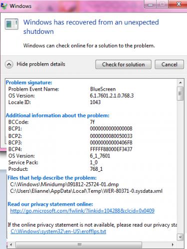 Twee weken geleden kreeg ik een melding dat ik deel uitmaakte van een botnet, via dit forum heb ik alle virussen verwijderd en mijn gecompter opgeschoond mbh combifix en cc-cleaner. zie dit onderwerp Maar gisteren kreeg ik ineens een melding, nadat mijn beeld 10 seconden op zwart ging, dat mijn display driver stopped responding maar dat het was hersteld. Na de melding was er niets raars aan de hand, maar nu net startte ik mijn computer weer op, maar ipv de normale opstartprocedure kreeg ik de volgende meldingen: Vervolgens heb ik mijn computer weer opnieuw opgestart, dit ging gewoon zoals normaal. Echter, na het inloggen kreeg weer een melding: Op dit moment lijkt mijn computer normaal te werken, misschien dat hij een tikkeltje langzamer is dan anders. Maar wat moet ik nu doen? En wat houden al die meldingen in?