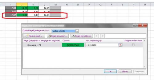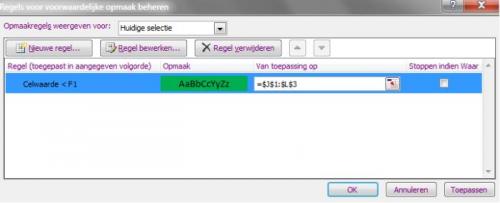 13. Je moet de $ wegdoen bij uw regels van voorwaardelijke opmaak gewoon Celwaarde < F1 Wanneer je op de derde rij gaat staan van jouw getallen, en je roept voorwaardelijke opmaak op, dan zal excel nog steeds F1 laten zien, maar in feite is dat dan Celwaarde<F3. (zie afbeelding hieronder). Maar jouw dollartekens moeten zeker weg! Dollartekens wil zeggen: "hou de rij/kolom vast, en pas rijen/kolommen niet aan bij gebruik vulgreep" .