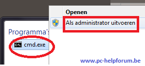 1. Klik op de ronde startknop onderaan links van je scherm en typ het woord cmd. Druk nog NIET op enter. U ziet helemaal bovenaan het menu een zwart kadertje met daarnaast de tekst cmd.exe Rechtsklik op cmd.exe en kies "Als administrator uitvoeren". (zie afbeelding) 2. U krijgt nu een zwart DOS-scherm. Om het "super administrator account" te activeren, typ je in het zwarte scherm volgend commando: net user administrator /active:yes Om het "super administrator account" te deactiveren typ je net user administrator /active:no Als je een paswoord wil geven aan je "super administrator account" typ je "Net user administrator" gevolgd door het paswoord, bijvoorbeeld: net user administrator P@$$w0rd net user administrator /activate:yes Let op : door je aan te melden met een "super administrator account" werk je wel met onbeperkte rechten. Dit geeft malafide software de kans om probleemloos toegang tot je systeemconfiguratie te krijgen. Het is dan ook aangewezen om het "super administrator account" onmiddellijk uit te schakelen, nadat je de taak waarvoor je dit account nodig had, hebt uitgevoerd. Auteur artikel: Kurtt en KAPE -