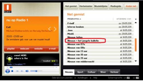 Wilt u graag alle radiozenders van België op een rijtje? Ga dan naar deze site. Als u deze website opent met Firefox, en op een radiozender klikt, kunt u de boodschap "ontbrekende plugin installeren" krijgen. Als u dan op de tekst "ontbrekende plugin installeren" klikt, gebeurt er niets. Hoe op te lossen? Om de radiozenders toch afgespeeld te krijgen in Firefox, moet u de add-on van Windows Media Player handmatig installeren, dat doet u hier. Deze add-on werkt ook perfect onder Windows 7. Het installeren van deze addon zorgt er ook voor dat je nu ook fatsoenlijk kan luisteren naar de radiospeler van de VRT op hun website (zonder verbindingsproblemen). Luister hier. Een tip: als je het laatste radio bulletin wil horen van de vrt, ga dan naar "Net gemist" en kies "Nieuws - het jongste bulletin". (zie afbeelding) Dus als je bijvoorbeeld om 16u30 het nieuws van 16u00 wil horen, klik je gewoon op "Nieuws-het jongste bulletin". -