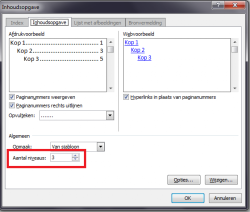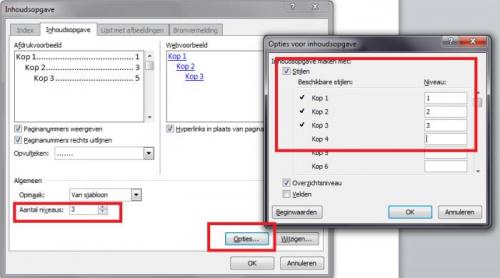 1. Welke versie van Word gebruikt u? 2. Voeg nog eens de inhoudsopgave toe. Let nu eens op het venster waar je dat kan invoegen. Daar staat "Aantal niveaus". Zet dit op 3 of 4. Zie printscreen: Druk daarna op de knop Opties... (zie ook printscreen hier vanboven) Zorg dat tot niveau 3 of 4 staat ingevuld: Lukt het nu? Zorg dus dat tot niveau 3 of 4 zeker is ingevuld in de dialoogvensters.