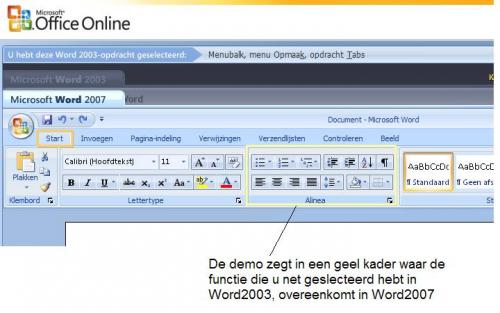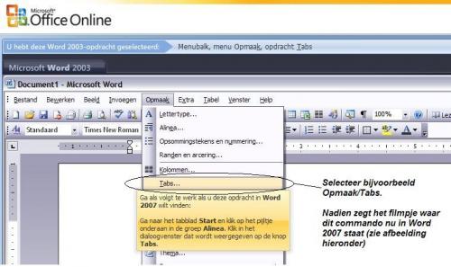 De meeste onder ons zijn Word 2003 gewoon. Stel, je wil weten waar de tabinstellingen zitten in Word 2007. In Word 2003 kunnen we er blindelings heengaan: via Opmaak/Tabs. Maar waar zit dat in Word 2007? Heel eenvoudig. Voer dezelfde handelingen uit in deze website van Microsoft. Waar komt het geselecteerde opdracht mee overeen in Word 2007 : Zo werkt dit met elk commando dat u gewoon bent van Word2003. Het filmpje zegt waarmee dit overeenkomt in Word2007/2010. Bron: Microsoft. -