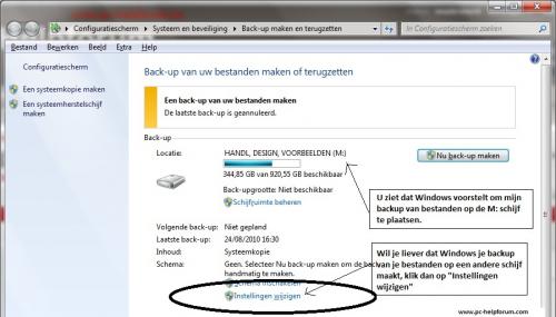 Een volledige kopie van je computer wordt in Windows 7 een systeemkopie genoemd. Een systeemkopie is een kopie van gans je computer. Dus niet alleen van je documenten, maar ook van al je geïnstalleerde programma's, favorieten, systeeminstellingen, ... Een andere naam die meestal gebruikt wordt om een systeemkopie aan te duiden is image. A. Een volledige backup maken met de Windows 7-Backup ► Klik onderaan links op de ronde knop Start. ▼ Tik het woord backups in (zie afbeelding hieronder). Druk nog NIET op enter. Kies bovenaan voor "Een backup van uw computer maken" ▼ Aan de linkerkant kiest u voor "Een systeemkopie maken" ► Nu kan u kiezen waarop je de backup wenst te bewaren. Meestal kan je kiezen uit een externe harde schijf. Op de externe harde schijf zal een map WindowsImageBackup gemaakt worden. Een klein nadeel is dat u niet mag kiezen waar (dus in welke map) je de kopie plaatst. De backupmap komt automatisch in de hoofddirectory van je externe harde schijf. Uw gemaakte backup nu terugzetten. Hoe? Wil je een volledige backup terugzetten, moet je gebruik maken van een herstelcd. Die schijf kan je hier aanmaken. Je hoeft niet echt een systeemherstelschijf aan te maken in Windows 7 want het gaat ook zonder. Je kan de reparatieopties van Windows 7 ook bereiken door op F8 te drukken tijdens het opstarten van je computer (druk meerdere keren op F8 voordat het logo van windows verschijnt). Kies daarna Uw computer herstellen en bevestig met enter. Nu krijgt u de wizard met een menu (Startup Repair, System Restore, System image recovery, ...). Kies System Image Recovery en daarna wordt op de aangesloten externe harde schijven naar je backup gezocht! B. Een volledige backup maken met andere programma's Er bestaan ook nog andere programma's waarmee je gratis een volledige kopie van je computer kan maken + handleiding: 1. Paragon Backup Recovery Free (gratis) 2. Macrium Free Reflect (gratis) 3. Acronis (niet gratis) Wil je slechts een backup maken van enkele bestanden (en dus niet van heel de computer), volg dan deze procedure: http://www.pc-helpforum.be/f251/enkel-een-kopie-van-je-bestanden-27204/