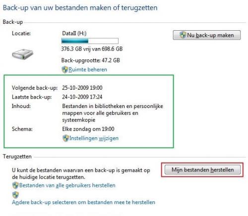 De systeemherstelschijf van Windows 7 die u zonet aangemaakt heeft, geeft u toegang tot de volgende opties bij het opstarten van je PC : Startup repair System restore System image recovery Windows memory diagnostic Command prompt Windows 7 gebruikers: Je hoeft niet echt een systeemherstelschijf aan te maken in Windows 7 want het gaat ook zonder : Je kan de reparatieopties van Windows 7 ook bereiken door op F8 te drukken tijdens het opstarten van je computer (druk meerdere keren op F8 voordat het logo van windows verschijnt). Kies daarna Uw computer herstellen en bevestig met enter. Nu krijgt u de wizard met een menu (Startup Repair, System Restore, System image recovery, ...). Kies System Image Recovery en daarna wordt op de aangesloten externe harde schijven naar je backup gezocht!