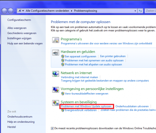 Je kan de probleemoplosser gebruiken om Windows Update te repareren: 1. Ga naar het startmenu en typ het woord probleemoplosser. Druk nog niet op enter. 2. Kies dan bovenaan in het menu voor "Problemen detecteren en oplossen". 3. Onderaan bij de groene tekst "Systeem en beveiliging" kiest u voor "Problemen met Windows Update oplossen". (zie rode kader in onderstaande afbeelding!) Auteur: Kurtt