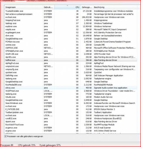hierbij het logbestand van Ccleaner en afbeelding van Taakbeheer. Ja HKCU:Run EPSON Stylus DX8400 Series SEIKO EPSON CORPORATION C:\Windows\system32\spool\DRIVERS\W32X86\3\E_FATICEE.EXE /FU "C:\Windows\TEMP\E_S4D7A.tmp" /EF "HKCU" Ja HKCU:Run swg Google Inc. "C:\Program Files\Google\GoogleToolbarNotifier\GoogleToolbarNotifier.exe" Ja HKLM:Run Adobe Reader Speed Launcher Adobe Systems Incorporated "C:\Program Files\Adobe\Reader 8.0\Reader\Reader_sl.exe" Ja HKLM:Run Apoint Alps Electric Co., Ltd. C:\Program Files\DellTPad\Apoint.exe Ja HKLM:Run AVG_TRAY AVG Technologies CZ, s.r.o. "C:\Program Files\AVG\AVG2012\avgtray.exe" Ja HKLM:Run BCSSync Microsoft Corporation "C:\Program Files\Microsoft Office\Office14\BCSSync.exe" /DelayServices Ja HKLM:Run DELL Webcam Manager Creative Technology Ltd. "C:\Program Files\Dell\Dell Webcam Manager\DellWMgr.exe" /s Ja HKLM:Run dscactivate "C:\Program Files\Dell Support Center\gs_agent\custom\dsca.exe" Ja HKLM:Run ECenter C:\Dell\E-Center\EULALauncher.exe Ja HKLM:Run Google Desktop Search Google "C:\Program Files\Google\Google Desktop Search\GoogleDesktop.exe" /startup Ja HKLM:Run ISUSScheduler Macrovision Corporation "C:\Program Files\Common Files\InstallShield\UpdateService\issch.exe" -start Ja HKLM:Run NvCplDaemon Microsoft Corporation RUNDLL32.EXE C:\Windows\system32\NvCpl.dll,NvStartup Ja HKLM:Run NVHotkey Microsoft Corporation rundll32.exe C:\Windows\system32\nvHotkey.dll,Start Ja HKLM:Run OEM02Mon.exe Creative Technology Ltd. C:\Windows\OEM02Mon.exe Ja HKLM:Run PCMService CyberLink Corp. "C:\Program Files\Dell\MediaDirect\PCMService.exe" Ja HKLM:Run ROC_roc_ssl_v12 "C:\Program Files\AVG Secure Search\ROC_roc_ssl_v12.exe" / /PROMPT /CMPID=roc_ssl_v12 Ja HKLM:Run RoxWatchTray Sonic Solutions "C:\Program Files\Common Files\Roxio Shared\9.0\SharedCOM\RoxWatchTray9.exe" Ja HKLM:Run SigmatelSysTrayApp IDT, Inc. %ProgramFiles%\SigmaTel\C-Major Audio\WDM\sttray.exe Ja HKLM:Run SunJavaUpdateSched Sun Microsystems, Inc. "C:\Program Files\Common Files\Java\Java Update\jusched.exe" Ja HKLM:Run vProt "C:\Program Files\AVG Secure Search\vprot.exe" Ja HKLM:Run Windows Defender Microsoft Corporation %ProgramFiles%\Windows Defender\MSASCui.exe -hide Ja Startup Common Digital Line Detect.lnk Avanquest Software C:\Program Files\Digital Line Detect\DLG.exe Ja Startup Common QuickSet.lnk Macrovision Corporation C:\Windows\Installer\{7F0C4457-8E64-491B-8D7B-991504365D1E}\NewShortcut2_53A01CC614B04512A2E710D39BF83DC4.exe