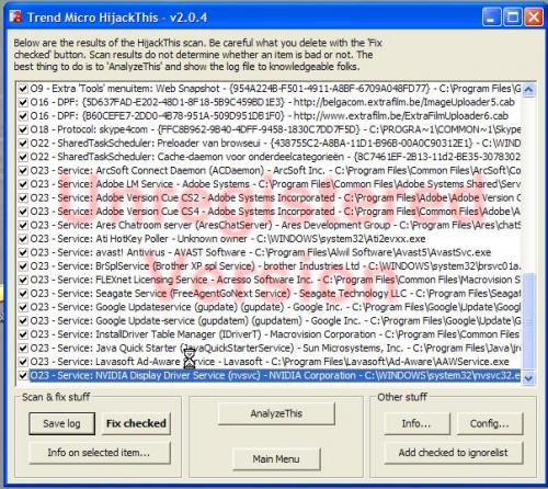 problemen met mails en andere afbeeldingenfa088505 reageerde op fa088505's topic in Archief Internet & Netwerk Logfile of Trend Micro HijackThis v2.0.4 Scan saved at 13:37:16, on 21/10/2011 Platform: Windows XP SP3 (WinNT 5.01.2600) MSIE: Internet Explorer v8.00 (8.00.6001.18702) Boot mode: Normal Running processes: C:\WINDOWS\System32\smss.exe C:\WINDOWS\system32\winlogon.exe C:\WINDOWS\system32\services.exe C:\WINDOWS\system32\lsass.exe C:\WINDOWS\system32\nvsvc32.exe C:\WINDOWS\system32\svchost.exe C:\WINDOWS\System32\svchost.exe C:\Program Files\Alwil Software\Avast5\AvastSvc.exe C:\WINDOWS\Explorer.EXE C:\WINDOWS\system32\brsvc01a.exe C:\WINDOWS\system32\spoolsv.exe C:\WINDOWS\system32\brss01a.exe C:\Program Files\Common Files\ArcSoft\Connection Service\Bin\ACService.exe C:\Program Files\Adobe\Adobe Version Cue CS2\bin\VersionCueCS2.exe C:\Program Files\Seagate\SeagateManager\Sync\FreeAgentService.exe C:\Program Files\Java\jre6\bin\jqs.exe C:\WINDOWS\system32\svchost.exe C:\Program Files\Adobe\Adobe Version Cue CS2\data\database\bin\mysqld-nt.exe C:\Program Files\Alwil Software\Avast5\avastUI.exe C:\Program Files\Adobe\Adobe Version Cue CS2\ControlPanel\VersionCueCS2Tray.exe C:\WINDOWS\system32\ctfmon.exe C:\Program Files\Gadwin Systems\PrintScreenPro\PrintScreenPro.exe C:\Program Files\Lavasoft\Ad-Aware\AAWService.exe C:\Program Files\Lavasoft\Ad-Aware\AAWTray.exe C:\PROGRA~1\MICROS~2\OFFICE11\ois.exe C:\Program Files\Internet Explorer\IEXPLORE.EXE C:\Program Files\Internet Explorer\IEXPLORE.EXE C:\Program Files\Trend Micro\HiJackThis\HiJackThis.exe R1 - HKCU\Software\Microsoft\Internet Explorer\Main,Search Bar = %s - Crawler.com R1 - HKCU\Software\Microsoft\Internet Explorer\Main,Search Page = ${URL_SEARCHPAGE} R0 - HKCU\Software\Microsoft\Internet Explorer\Main,Start Page = SeniorenNet - de startpagina voor senioren: de actieve 50-plussers R1 - HKLM\Software\Microsoft\Internet Explorer\Main,Default_Page_URL = Hotmail, Messenger, nieuws en entertainment vind je op MSN.nl R1 - HKLM\Software\Microsoft\Internet Explorer\Main,Default_Search_URL = Bing R1 - HKLM\Software\Microsoft\Internet Explorer\Main,Search Page = ${URL_SEARCHPAGE} R0 - HKLM\Software\Microsoft\Internet Explorer\Main,Start Page = Downloads - Programmadownloads zijn gecheckt tegen virus en spyware R0 - HKLM\Software\Microsoft\Internet Explorer\Search,SearchAssistant = Internet Explorer Search R0 - HKLM\Software\Microsoft\Internet Explorer\Search,CustomizeSearch = Search Assistant O2 - BHO: ContributeBHO Class - {074C1DC5-9320-4A9A-947D-C042949C6216} - C:\Program Files\Adobe\/Adobe Contribute CS4/contributeieplugin.dll O2 - BHO: AcroIEHelperStub - {18DF081C-E8AD-4283-A596-FA578C2EBDC3} - C:\Program Files\Common Files\Adobe\Acrobat\ActiveX\AcroIEHelperShim.dll O2 - BHO: Skype add-on (mastermind) - {22BF413B-C6D2-4d91-82A9-A0F997BA588C} - C:\Program Files\Skype\Toolbars\Internet Explorer\SkypeIEPlugin.dll O2 - BHO: DriveLetterAccess - {5CA3D70E-1895-11CF-8E15-001234567890} - C:\WINDOWS\system32\dla\tfswshx.dll O2 - BHO: Adobe PDF Conversion Toolbar Helper - {AE7CD045-E861-484f-8273-0445EE161910} - C:\Program Files\Common Files\Adobe\Acrobat\ActiveX\AcroIEFavClient.dll O2 - BHO: SpoofStick BHO - {CBA74CDA-DF78-4AD9-954E-3B15D0A993DE} - C:\Program Files\CoreStreet\SpoofStick\SpoofStickBHO.dll O2 - BHO: Java Plug-In 2 SSV Helper - {DBC80044-A445-435b-BC74-9C25C1C588A9} - C:\Program Files\Java\jre6\bin\jp2ssv.dll O2 - BHO: JQSIEStartDetectorImpl - {E7E6F031-17CE-4C07-BC86-EABFE594F69C} - C:\Program Files\Java\jre6\lib\deploy\jqs\ie\jqs_plugin.dll O2 - BHO: SmartSelect - {F4971EE7-DAA0-4053-9964-665D8EE6A077} - C:\Program Files\Common Files\Adobe\Acrobat\ActiveX\AcroIEFavClient.dll O3 - Toolbar: SpoofStick - {4D46ED77-1429-4CF6-8F63-C84B5D710BAF} - C:\Program Files\CoreStreet\SpoofStick\SpoofStick.dll O3 - Toolbar: Adobe PDF - {47833539-D0C5-4125-9FA8-0819E2EAAC93} - C:\Program Files\Common Files\Adobe\Acrobat\ActiveX\AcroIEFavClient.dll O3 - Toolbar: Contribute Toolbar - {517BDDE4-E3A7-4570-B21E-2B52B6139FC7} - C:\Program Files\Adobe\/Adobe Contribute CS4/contributeieplugin.dll O4 - HKLM\..\Run: [avast5] "C:\Program Files\Alwil Software\Avast5\avastUI.exe" /nogui O4 - HKLM\..\Run: [NvCplDaemon] RUNDLL32.EXE C:\WINDOWS\system32\NvCpl.dll,NvStartup O4 - HKLM\..\Run: [Adobe Version Cue CS2] C:\Program Files\Adobe\Adobe Version Cue CS2\ControlPanel\VersionCueCS2Tray.exe O4 - HKLM\..\Run: [QuickTime Task] "C:\Program Files\QuickTime\qttask.exe" -atboottime O4 - HKCU\..\Run: [ctfmon.exe] C:\WINDOWS\system32\ctfmon.exe O4 - HKCU\..\Run: [Gadwin PrintScreen Pro] "C:\Program Files\Gadwin Systems\PrintScreenPro\PrintScreenPro.exe" /nosplash O4 - HKUS\S-1-5-19\..\Run: [CTFMON.EXE] C:\WINDOWS\system32\CTFMON.EXE (User 'Lokale service') O4 - HKUS\S-1-5-20\..\Run: [CTFMON.EXE] C:\WINDOWS\system32\CTFMON.EXE (User 'Netwerkservice') O4 - HKUS\S-1-5-18\..\Run: [CTFMON.EXE] C:\WINDOWS\system32\CTFMON.EXE (User 'SYSTEM') O4 - HKUS\.DEFAULT\..\Run: [CTFMON.EXE] C:\WINDOWS\system32\CTFMON.EXE (User 'Default user') O8 - Extra context menu item: Google Sidewiki... - res://C:\Program Files\Google\Google Toolbar\Component\GoogleToolbarDynamic_mui_en_6CE5017F567343CA.dll/cmsidewiki.html O9 - Extra button: Skype - {77BF5300-1474-4EC7-9980-D32B190E9B07} - C:\Program Files\Skype\Toolbars\Internet Explorer\SkypeIEPlugin.dll O9 - Extra button: Onderzoek - {92780B25-18CC-41C8-B9BE-3C9C571A8263} - C:\PROGRA~1\MICROS~2\OFFICE11\REFIEBAR.DLL O9 - Extra button: (no name) - {e2e2dd38-d088-4134-82b7-f2ba38496583} - C:\WINDOWS\Network Diagnostic\xpnetdiag.exe O9 - Extra 'Tools' menuitem: @xpsp3res.dll,-20001 - {e2e2dd38-d088-4134-82b7-f2ba38496583} - C:\WINDOWS\Network Diagnostic\xpnetdiag.exe O9 - Extra button: Messenger - {FB5F1910-F110-11d2-BB9E-00C04F795683} - C:\Program Files\Messenger\msmsgs.exe O9 - Extra 'Tools' menuitem: Windows Messenger - {FB5F1910-F110-11d2-BB9E-00C04F795683} - C:\Program Files\Messenger\msmsgs.exe O9 - Extra button: Web Snapshot - {9