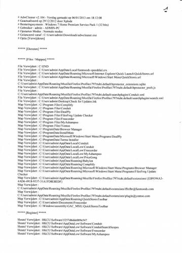 Ik heb dus de scan met Adw uitgevoerd, het log willen opslagen waarin ik niet geslaagd ben (ik gebruik Open Office?). Ik vond het niet meer terug in "Administrator". Dus wat geprutst. Het open log geprint (jpeg) en ingescand. Het zit nu in mijn "Afbeeldingen". -