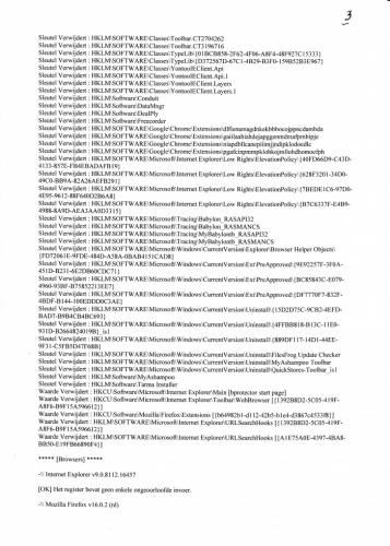 Ik heb je instructies scrupuleus opgevolgd. Een scan met MBAM leverde in de 20 geïnfecteerde objecten op, die ik met succes verwijderd heb. Voor alle zekerheid voerde ik een 2e scan uit, die geen infecties meer detecteerde. Ik slaagde er wel niet in onder het tablad met de logbestanden het resultaat te openen van de 1ste. scan. Ligt dit aan het feit dat ik niet Word gebruik maar Open Office? Maar na de 2e scan heb ik het resultaat niet opgeslagen, zodat je dit hieronder kan vinden, en de bevestiging geeft dat alles clean is. Logfile of Trend Micro HijackThis v2.0.4 Scan saved at 16:17:05, on 27/09/2012 Platform: Windows 7 SP1 (WinNT 6.00.3505) MSIE: Internet Explorer v9.00 (9.00.8112.16450) Boot mode: Normal Running processes: C:\Windows\system32\Dwm.exe C:\Windows\system32\taskhost.exe C:\Windows\Explorer.EXE C:\Windows\System32\rundll32.exe C:\Program Files\CyberLink\Power2Go\CLMLSvc.exe C:\Program Files\CyberLink\PowerDVD9\PDVD9Serv.exe C:\Program Files\CyberLink\Shared files\brs.exe C:\Program Files\VMware\VMware Player\hqtray.exe C:\Windows\System32\igfxtray.exe C:\Windows\System32\hkcmd.exe C:\Windows\System32\igfxpers.exe C:\Program Files\Belgium Identity Card\beid35gui.exe C:\Program Files\Canon\Solution Menu EX\CNSEMAIN.EXE C:\Program Files\iTunes\iTunesHelper.exe C:\Program Files\Microsoft Security Client\msseces.exe C:\Program Files\Freecorder\FLVSrvc.exe C:\Program Files\Common Files\Java\Java Update\jusched.exe C:\Program Files\Samsung\Samsung New PC Studio\NPSAgent.exe C:\Users\admin\AppData\Roaming\Spotify\Data\SpotifyWebHelper.exe C:\Program Files\NETGEAR\WG111v3\WG111v3.exe C:\Program Files\YoWindow\yowindow.exe C:\Program Files\Internet Explorer\iexplore.exe C:\Program Files\Google\Google Toolbar\GoogleToolbarUser_32.exe C:\Windows\system32\Macromed\Flash\FlashUtil32_11_4_402_265_ActiveX.exe C:\Program Files\Internet Explorer\iexplore.exe C:\Windows\notepad.exe C:\Program Files\Trend Micro\HiJackThis\HiJackThis.exe R1 - HKCU\Software\Microsoft\Internet Explorer\Main,Search Bar = Preserve R1 - HKCU\Software\Microsoft\Internet Explorer\Main,Search Page = Bing R0 - HKCU\Software\Microsoft\Internet Explorer\Main,Start Page = START.BE startpagina België: de Belgische linkpagina index in Vlaanderen R1 - HKLM\Software\Microsoft\Internet Explorer\Main,Default_Page_URL = MSN.com R1 - HKLM\Software\Microsoft\Internet Explorer\Main,Default_Search_URL = Bing R1 - HKLM\Software\Microsoft\Internet Explorer\Main,Search Page = Bing R0 - HKLM\Software\Microsoft\Internet Explorer\Search,SearchAssistant = R0 - HKLM\Software\Microsoft\Internet Explorer\Search,CustomizeSearch = R1 - HKCU\Software\Microsoft\Windows\CurrentVersion\Internet Settings,ProxyOverride = *.local O2 - BHO: AcroIEHelperStub - {18DF081C-E8AD-4283-A596-FA578C2EBDC3} - C:\Program Files\Common Files\Adobe\Acrobat\ActiveX\AcroIEHelperShim.dll O2 - BHO: Java Plug-In SSV Helper - {761497BB-D6F0-462C-B6EB-D4DAF1D92D43} - C:\Program Files\Java\jre7\bin\ssv.dll O2 - BHO: Windows Live ID Sign-in Helper - {9030D464-4C02-4ABF-8ECC-5164760863C6} - C:\Program Files\Common Files\Microsoft Shared\Windows Live\WindowsLiveLogin.dll O2 - BHO: Windows Live Messenger Companion Helper - {9FDDE16B-836F-4806-AB1F-1455CBEFF289} - C:\Program Files\Windows Live\Companion\companioncore.dll O2 - BHO: Google Toolbar Helper - {AA58ED58-01DD-4d91-8333-CF10577473F7} - C:\Program Files\Google\Google Toolbar\GoogleToolbar_32.dll O2 - BHO: Java Plug-In 2 SSV Helper - {DBC80044-A445-435b-BC74-9C25C1C588A9} - C:\Program Files\Java\jre7\bin\jp2ssv.dll O2 - BHO: ChromeFrame BHO - {ECB3C477-1A0A-44BD-BB57-78F9EFE34FA7} - C:\Program Files\Google\Chrome\Application\21.0.1180.89\npchrome_frame.dll O3 - Toolbar: Google Toolbar - {2318C2B1-4965-11d4-9B18-009027A5CD4F} - C:\Program Files\Google\Google Toolbar\GoogleToolbar_32.dll O4 - HKLM\..\Run: [CLMLServer] "C:\Program Files\CyberLink\Power2Go\CLMLSvc.exe" O4 - HKLM\..\Run: [updateP2GoShortCut] "C:\Program Files\CyberLink\Power2Go\MUITransfer\MUIStartMenu.exe" "C:\Program Files\CyberLink\Power2Go" UpdateWithCreateOnce "SOFTWARE\CyberLink\Power2Go\6.0" O4 - HKLM\..\Run: [RemoteControl9] "C:\Program Files\CyberLink\PowerDVD9\PDVD9Serv.exe" O4 - HKLM\..\Run: [PDVD9LanguageShortcut] "C:\Program Files\CyberLink\PowerDVD9\Language\Language.exe" O4 - HKLM\..\Run: [bDRegion] C:\Program Files\Cyberlink\Shared Files\brs.exe O4 - HKLM\..\Run: [updatePPShortCut] "C:\Program Files\CyberLink\PowerProducer\MUITransfer\MUIStartMenu.exe" "C:\Program Files\CyberLink\PowerProducer" UpdateWithCreateOnce "Software\CyberLink\PowerProducer\5.0" O4 - HKLM\..\Run: [updatePSTShortCut] "C:\Program Files\CyberLink\Blu-ray Disc Suite\MUITransfer\MUIStartMenu.exe" "C:\Program Files\CyberLink\Blu-ray Disc Suite" UpdateWithCreateOnce "Software\CyberLink\PowerStarter" O4 - HKLM\..\Run: [VMware hqtray] "C:\Program Files\VMware\VMware Player\hqtray.exe" O4 - HKLM\..\Run: [Adobe ARM] "C:\Program Files\Common Files\Adobe\ARM\1.0\AdobeARM.exe" O4 - HKLM\..\Run: [igfxTray] C:\Windows\system32\igfxtray.exe O4 - HKLM\..\Run: [HotKeysCmds] C:\Windows\system32\hkcmd.exe O4 - HKLM\..\Run: [Persistence] C:\Windows\system32\igfxpers.exe O4 - HKLM\..\Run: [beid] "C:\Program Files\Belgium Identity Card\beid35gui.exe" /startup O4 - HKLM\..\Run: [CanonSolutionMenuEx] C:\Program Files\Canon\Solution Menu EX\CNSEMAIN.EXE /logon O4 - HKLM\..\Run: [APSDaemon] "C:\Program Files\Common Files\Apple\Apple Application Support\APSDaemon.exe" O4 - HKLM\..\Run: [unlockerAssistant] "C:\Program Files\Unlocker\UnlockerAssistant.exe" O4 - HKLM\..\Run: [iTunesHelper] "C:\Program Files\iTunes\iTunesHelper.exe" O4 - HKLM\..\Run: [MSC] "c:\Program Files\Microsoft Security Client\msseces.exe" -hide -runkey O4 - HKLM\..\Run: [Freecorder FLV Service] "C:\Program Files\Freecorder\FLVSrvc.exe" /run O4 - HKLM\..\Run: [sunJavaUpdateSched] "C:\Program Files\Common Files\Java\Java Update\jusched.exe" O4 - HKCU\..\Run: [AutoStartNPSAgent] C:\Program Files\Samsung\Samsung New PC Studio\NPS
