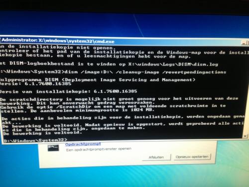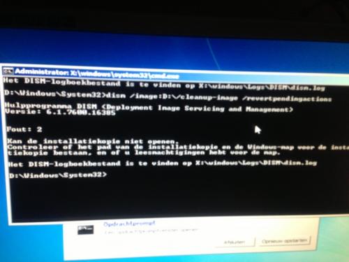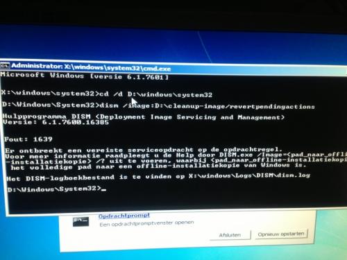 Wanneer ik deze regels uitvoer geeft hij aan dat er een fout is (1639): "Er ontbreekt een vereiste serviceopdracht op de opdrachtregel. Voor meer informatie raadpleegt u de helf door DISM.exe /Image=<pad_naar_offline-instalatiekopie>/? uit te voeren, waarbij <pad_naar_offline-installatiekopie> het volledige pad naar een offline-installatiekkopie van windows is. Het DISM - logboekbestand is te vinden op x:\windows\logs\DISM\dism.log"