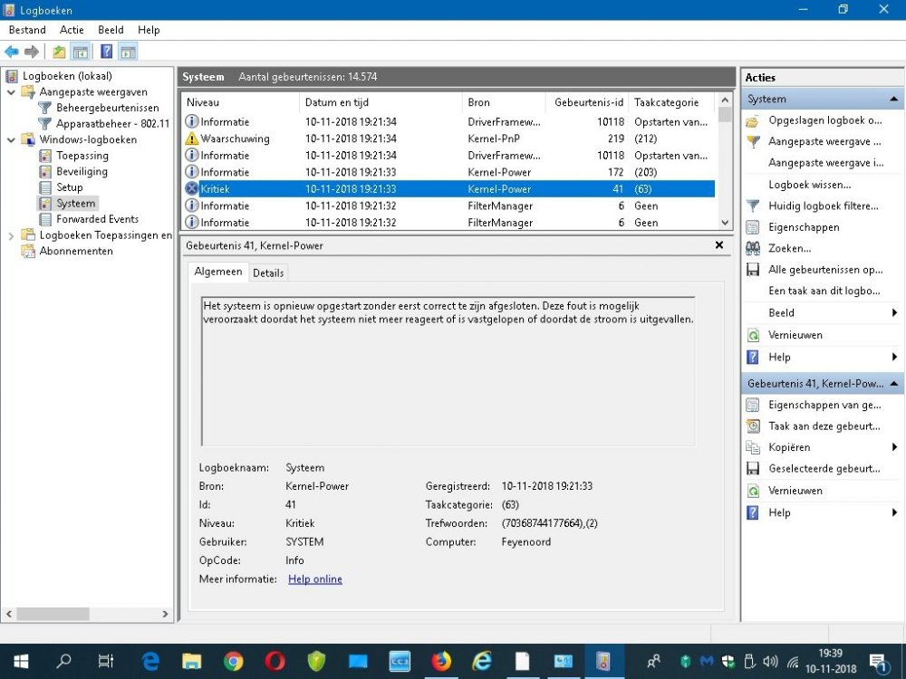 Hallo, Ik heb een probleem met mijn desktop, Windows 10. Ik weet niet of het één hardware probleem is of één malware infectie of dat het register beschadigd is. Mocht mijn probleem hier niet thuis horen in deze sectie dan a.u.b. verplaatsen naar het goede sectie. Wat is het geval. Vanuit het niets deed mijn computer raar, hij bevroor en ik kon niets anders doen dan hem met het aan/uit knop uitzetten. Oké, dat kan een keer gebeuren. Echter dat werd steeds vaker en het is nu een zeer vervelend probleem geworden. Wat heb ik gedaan om het te proberen op te lossen: 1e Virusscanner van Panda laten scannen , zonder resultaat. 2e Harde schijf C: schijfcontrole uitgevoerd, zonder resultaat. 3e Crystaldiskinfo uitgevoerd, harde schijf is prima . 4e Systeemherstel uitgevoerd naar een punt dat ik dacht dat alles goed werkte, zonder resultaat. 5e Toetsenbord vervangen door een ander, geen resultaat. 6e Muis vervangen door een ander, geen resultaat. 7e Malwarebytes laten lopen, geen resultaat. 8e Comodo firewall verwijderd, resultaat. Hij liep niet meer vast, 1 dag later begon het opnieuw. 9e Panda antivirusscanner verwijdert, geen resultaat. Ik heb verschillende firewall's geprobeerd en antivirusscanners maar tot nu toe geen resultaat geboekt, dus ik heb nu het firewall van Windows 10 lopen en het gratis antivirusscanner van Kaspersky geïnstalleerd om toch een beetje beveiligd te zijn. Mogelijk is het register beschadigd waardoor Windows 10 niet goed werkt,, mogelijk is het een hardware probleem of mogelijk is het een malware probleem die dit veroorzaakt, ik kom even hier niet uit en vraag of jullie met mij mijn pc willen controleren. Bij voorbaat mijn dank.
