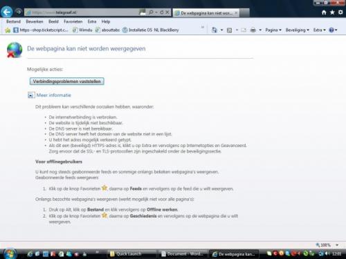 Hij doet het . Het probleem zit wel degelijks in dat ene S Https:// is een beveiligde zone, dat hebben alle banken bijvoorbeeld. Ik heb als opstart pagina Google staan : Google Zodra ik ik het internet op ga dan verrandert het opeens in https://google.nl. Daar zit de ellende. Toch is het raar want ik haalde de adresregel helemaal leeg en tikte telegraaf.nl en het kwam er gewoon niet in. Waarschijnlijk heeft het geholpen het opschonen van de troep op mijn pc. Hoe dan ook, het doet weer. Ik denk dat meer mensen daar last van zullen gaan krijgen, zoals eerder gezegd bij mijn zoon zijn gloednieuwe pc komt dit probleem ook voor. Maar nu weet ik de oplossing, . Nu mijn laptop, dat gecrasht is, mocht ik er niet uitkomen dan zou ik graag een beroep willen doen op jullie deskundigheid. Kape, heel erg bedankt voor je medewerking.
