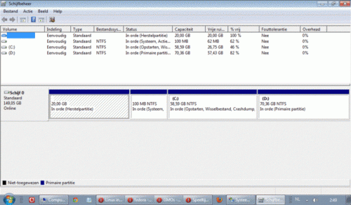 2. Als ik dat doe, kom ik niet verder dan "beheren". Klik ik daarop, dan gebeurt er helemaal niets. Maar waar het om gaat (vermoed ik) is: noch de C-schijf, noch de D-schijf is in stukjes gepartitioneerd. Alhoewel... het zou natuurlijk kunnen dat er 1 schijf in de computer zit en dat die in tweeën in gepartitioneerd...