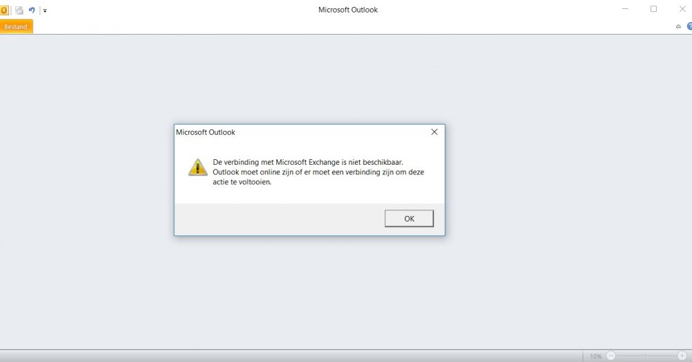 Als ik Outlook 2010 wil opstart, krijg ik direct op het scherm de tekst te zien als op de bijlage. "De verbinding met Microsoft Exchange is niet beschikbaar. Outlook moet online zijn of er moet een verbinding zijn om deze actie te voltooien". Als ik op "o.k." klik verschijnt het scherm, zoals op bijlage 2. Klik ik opnieuw op "o.k., dan verschijn het scherm van bijlage 1 weer. Ik kan dus niet met het programma werken. Wie kan mij zeggen welke stappen ik moet ondernemen om het probleem op te lossen? Ter info: ik heb Office 2010 al verwijderd en opnieuw geïnstalleerd, maar dat gaf geen verandering. Ik werk met Windows 10. Henk -