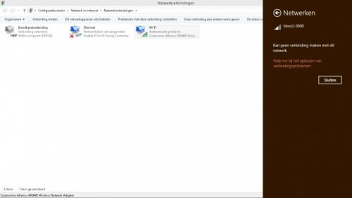 Sedert enkele dagen krijg ik geen verbinding meer met het internet met de laptop.Asus 512C,Win 8.1 en IE 11,heb alles geprobeert volgens miin kennis,vanuit configurateischerm alle mogelijke instellingen gecontroleerd zonder resultaat.Abonnee bij Belgacom en bbox2-0880,onder instellingen rechter benedenhoek v h scherm isvliegtuigstand uitgeschakeld en WIFI aan,automatisch verbinding maken is ook aangeduid maar als je op verbinding maken klikt geeft hij altijd aan dat hij geen verbinding kan maken en oplossen van verbindingsproblemen breng me ook geen oplossing.Kan maar aan één ding denken dat ik per ongeluk een toets heb ingedrukt die de verbinding uitschakeld maar in de helpfile van ASUS vind ik het niet terug.De functietoets en F2 schakelt enkel de vliegtuigstand aan of uit.Ben ten einde raad,graag een oplossing als het kan ,grtjs Jos;-).